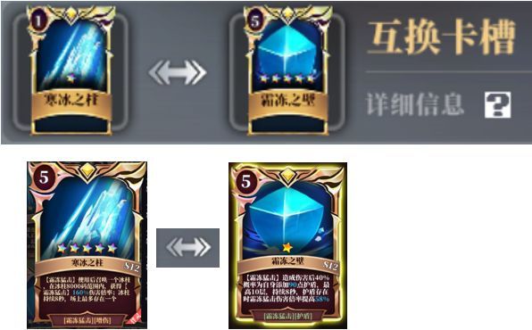 注意转换卡牌的规则,跨职业转换,被转换的卡牌不需要升级、升星、升彩。只需要升级前置卡就行;如果5星卡抽歪了,可以带同职业互换卡槽的伴灵把非核心5星卡和核心1星卡对调星级,比如: