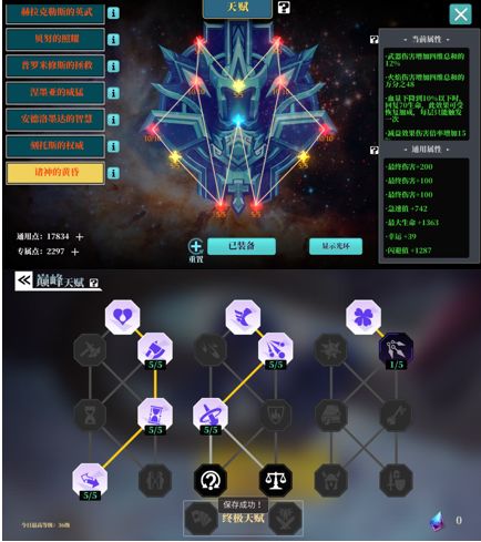 只选诸神天赋,其他不考虑,巅峰天赋左边一定点出减免伴灵技能CD的两个点;