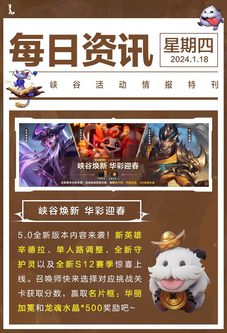 峡谷焕新,华彩迎春,全新5.0版本内容来袭!今日起,截止至1月29日,召唤师完成挑战任务获取分数,即可领取名片框“华丽加冕”、龙魂水晶*500奖励。