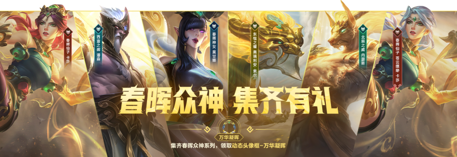 春晖众神,万物归春!召唤师若集齐包括春晖仙子 苍云飘渺 卡莎在内的六款春晖众神系列皮肤,即可领取动态头像框-万华凝晖!