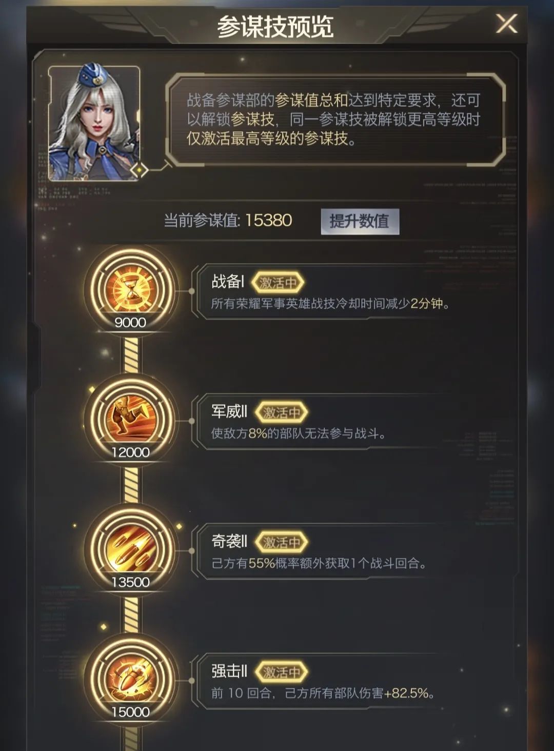 任命在战备参谋部时,部队攻击+20.00%;任命在战备参谋部时,坦克攻击+80.00%。