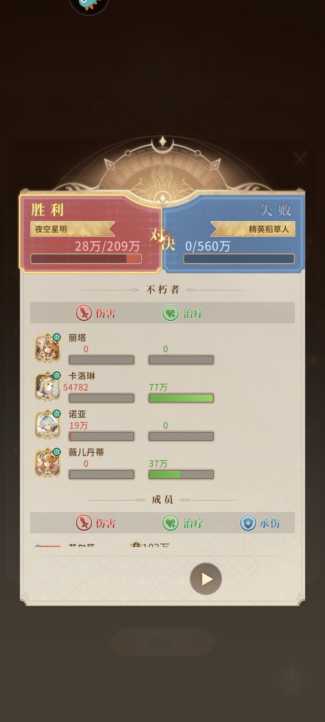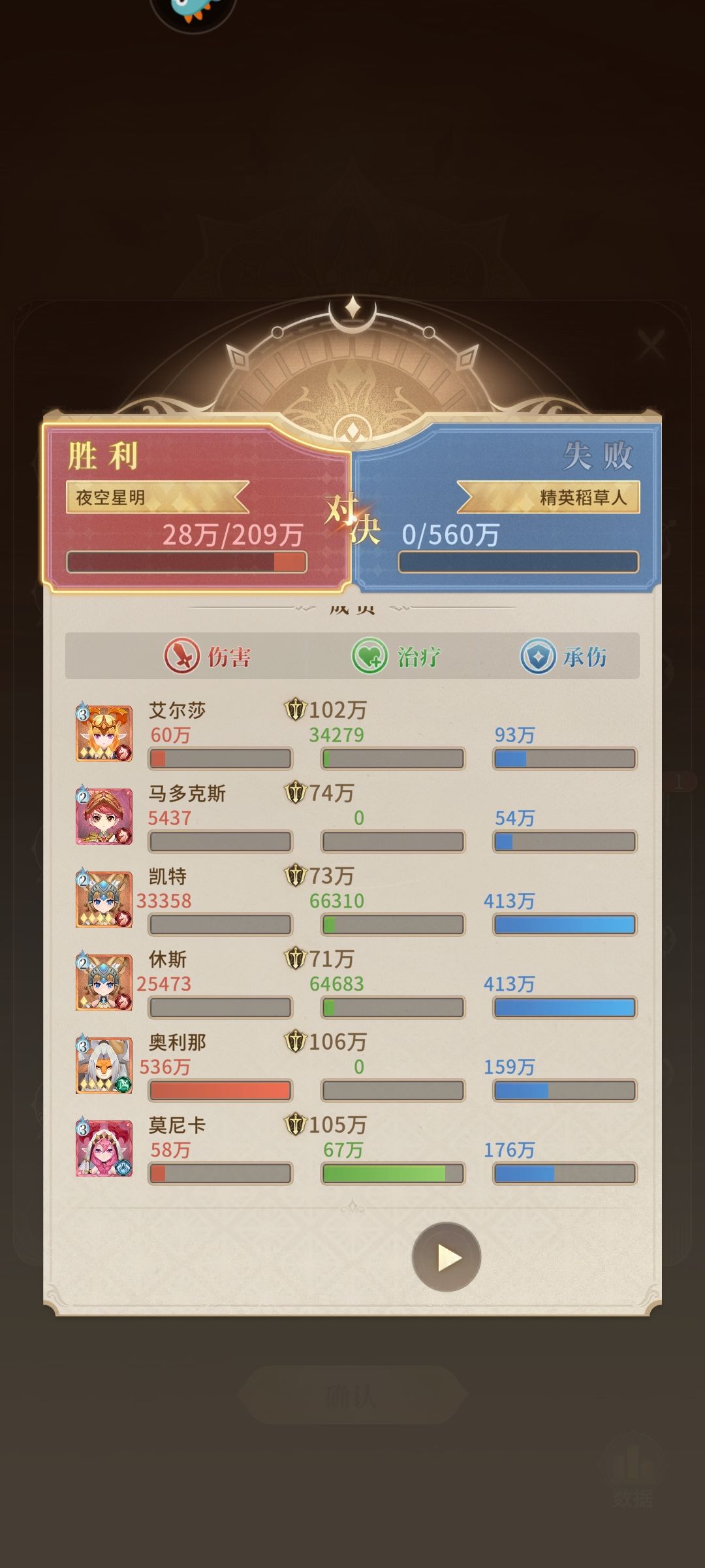 昨天晚上忘记发帖了,100级通关风系会回归所以我选择卡一天再打因为还是限时的。100级训练营的稻草人是群友给的思路。控制住稻草人然后输出,单有一个问题我材料不够。所以选择龙骑100级,牛射140级,龙奶125级。3个辅助骑士100级。控制住然后输出就过关了,建议英雄带回血护盾控制。因为图片位置有限剩下放底下。