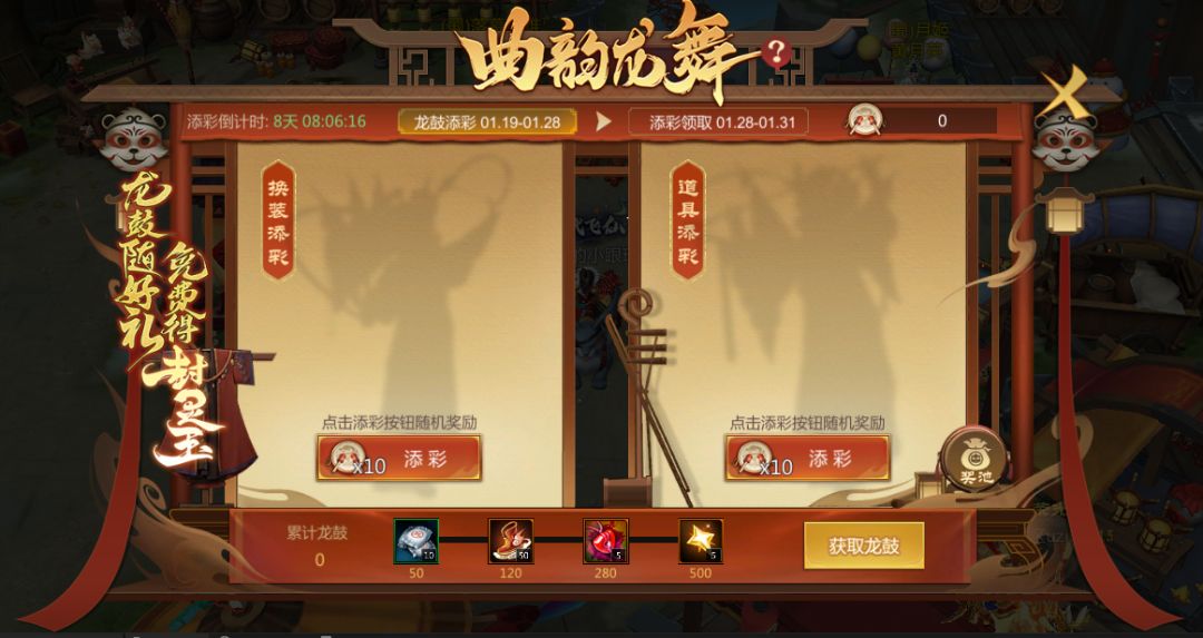 除了龙鼓累计奖励之外,仙术师们还可以使用龙鼓刷新换装和道具两个区域的添彩,每次刷新消耗龙鼓*10,奖池中的礼物都价值不菲,大家可要认真挑选!