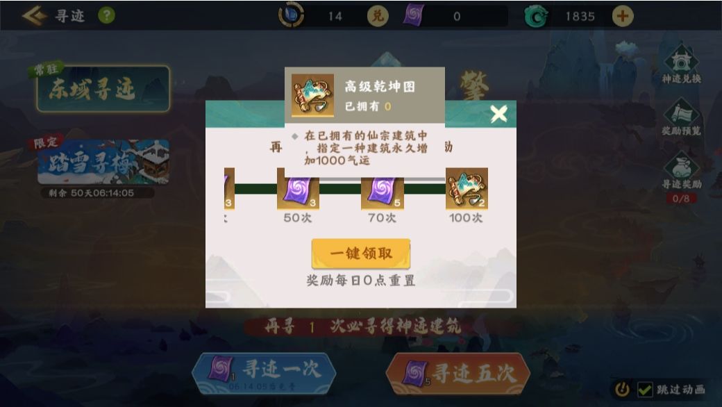 建议至少攒够81抽,或者是等有活动的时候再抽,这样参加活动拿奖励的同时,还可以领取每日目标的最终奖-高级乾坤图。可以指定一种建筑永久增加1000气运,如果该建筑的数量是6,那么一共会增加6000的气运。