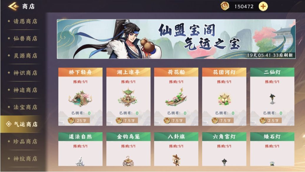 别忘了还有仙盟里面的珍宝阁,仙盟币的好去处,每一期刷新的神迹建筑购买就能直接增加气运。