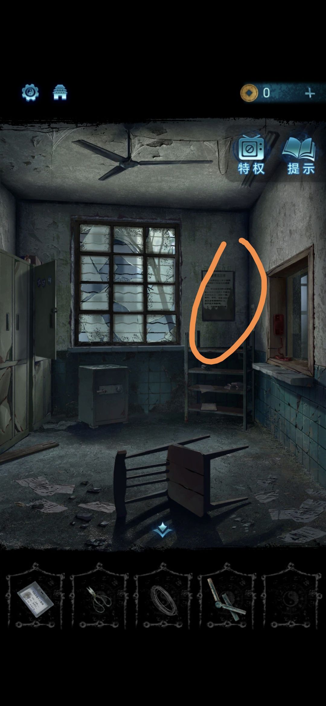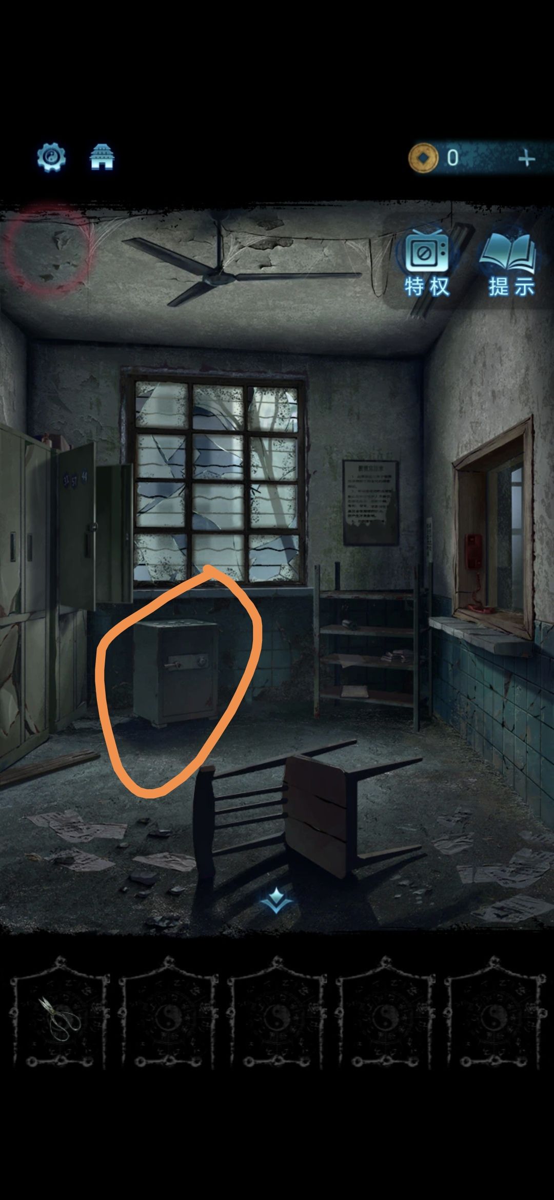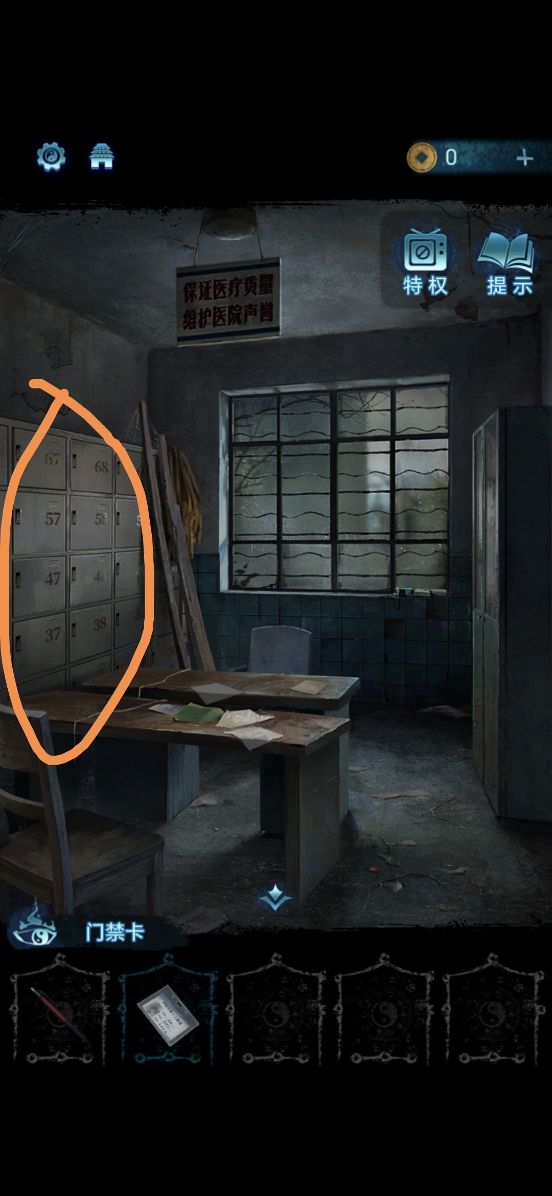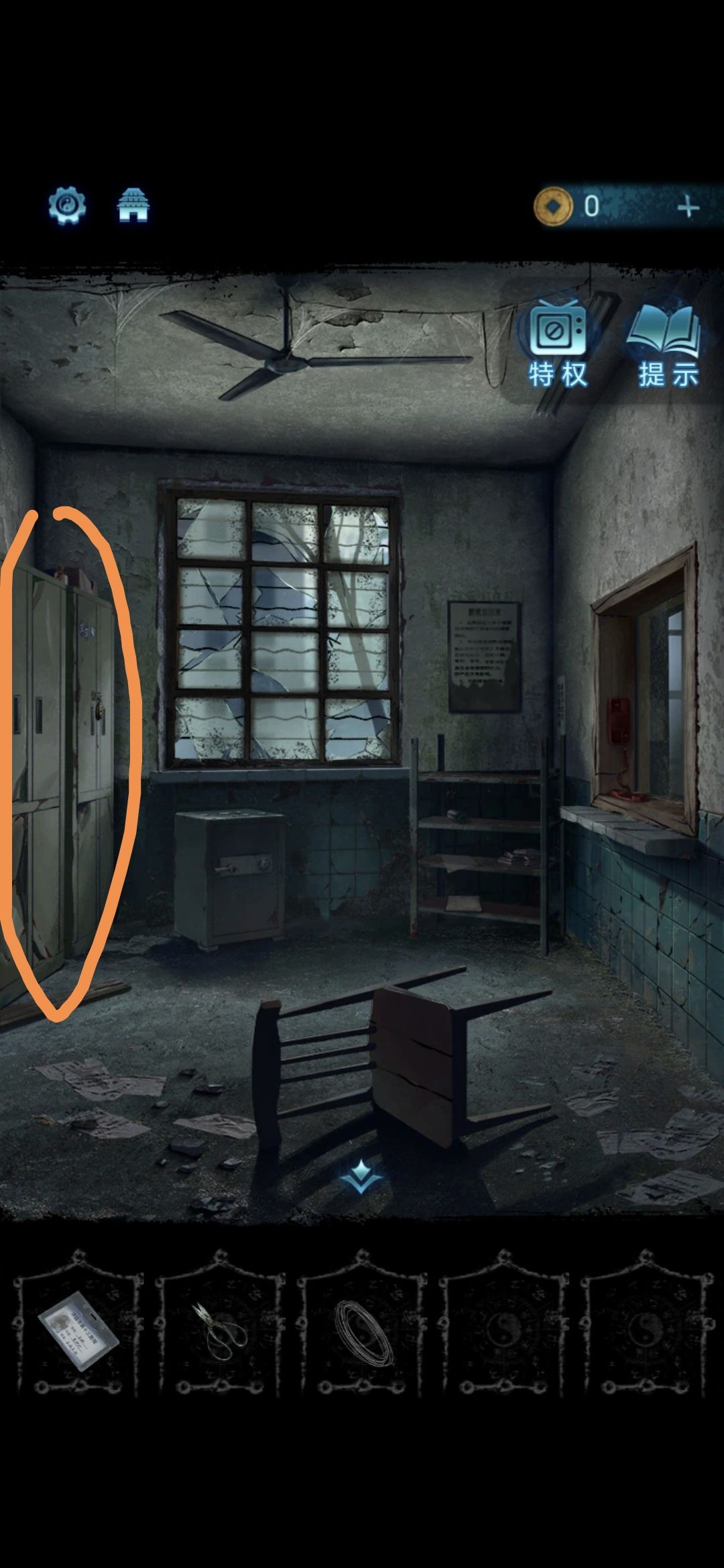 进入探望室,根据架子上的病例本上的符号,按照左侧柜子上的标号顺序排列,解开柜子上的锁,获得吊扇