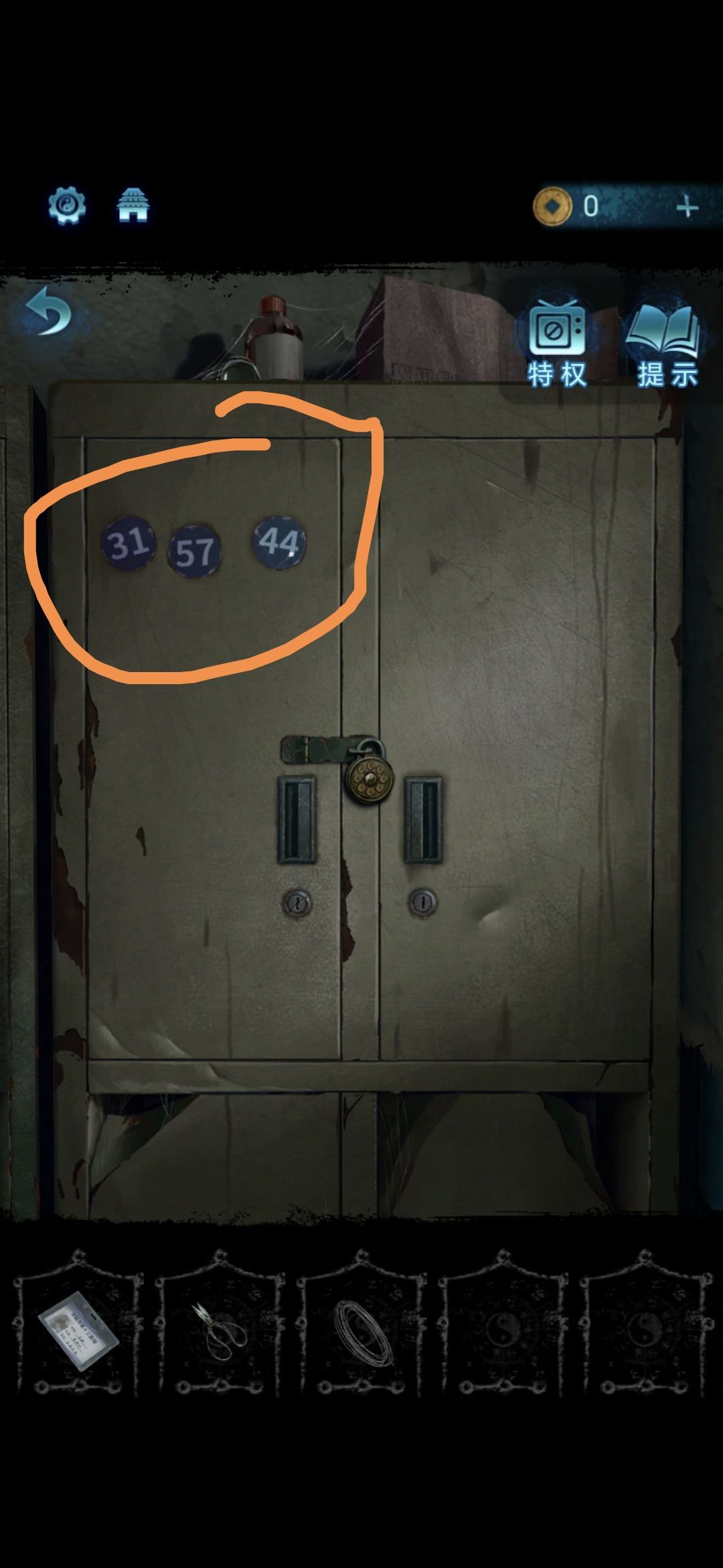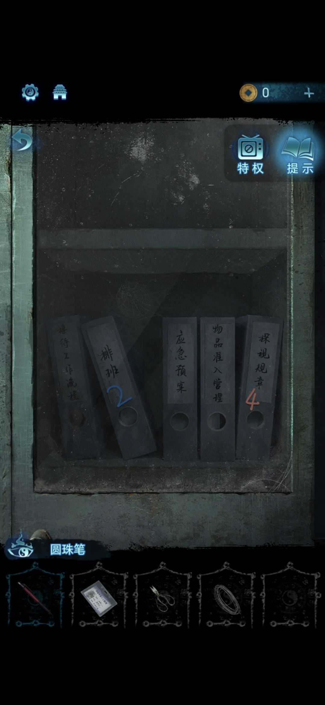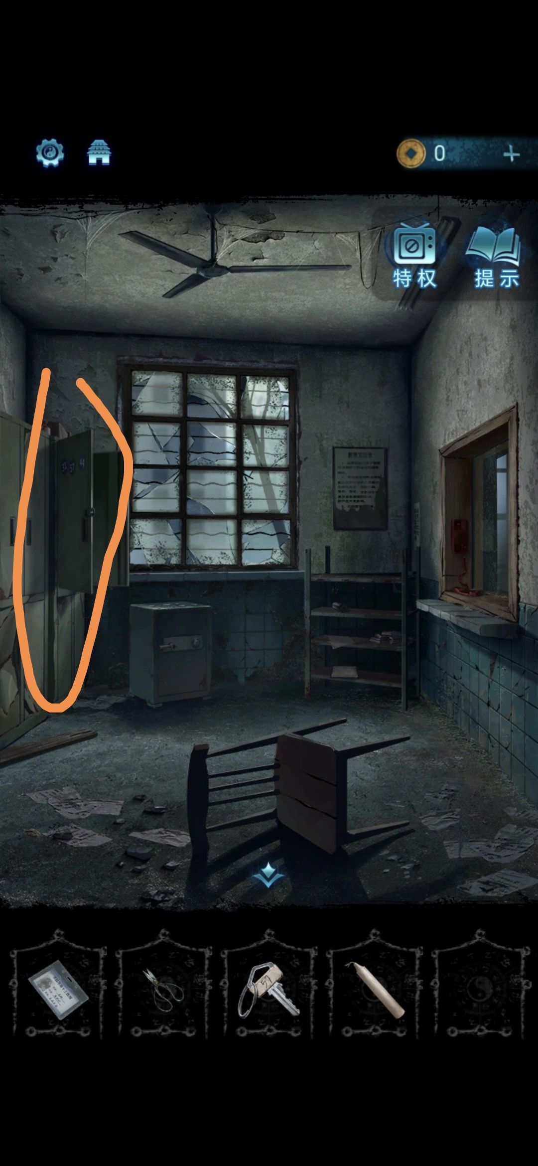 进入探望室,根据架子上的病例本上的符号,按照左侧柜子上的标号顺序排列,解开柜子上的锁,获得吊扇
