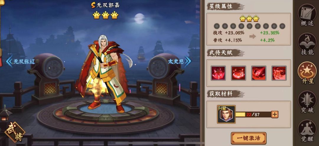 在阵法配置方面,如果对自身操作足够自信且队伍里的治疗武将非常强悍,没有多少治疗压力,可以考虑选择激活三才阵法尤其是5件以上红色三才阵法;如果达不到这个条件,则建议优先激活5件以上红色六甲阵法,发挥12次后的爆发伤害优势。