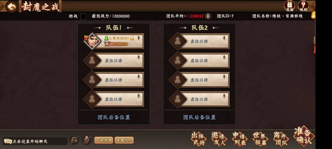 炼狱·穹渊邪境与普通·穹渊邪境的组队模式一样,也是推荐8人团队,分为1、2两队。从该团本推荐最低战力1200万的门槛来看,挑战难度不一般,因此,核心是要保障充足的输出能力和治疗能力。