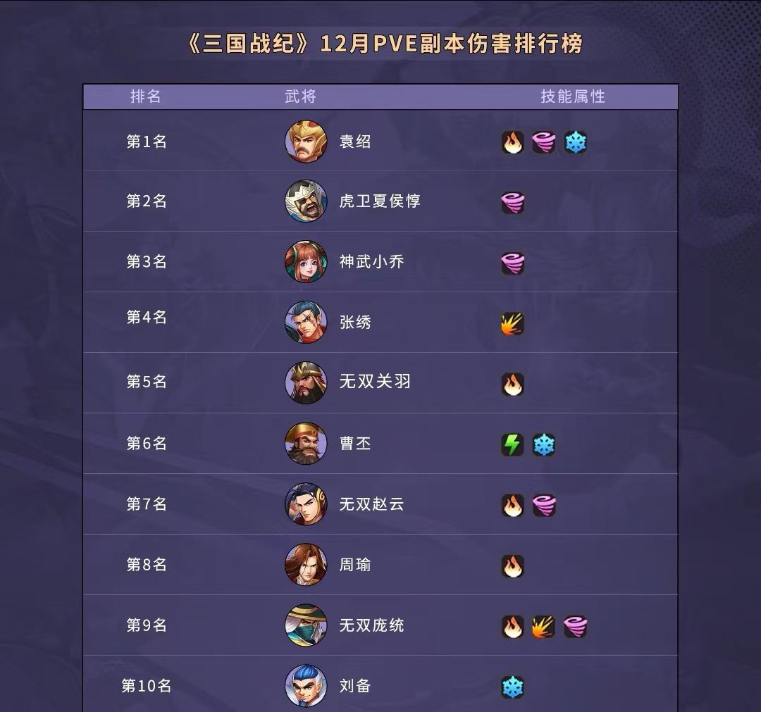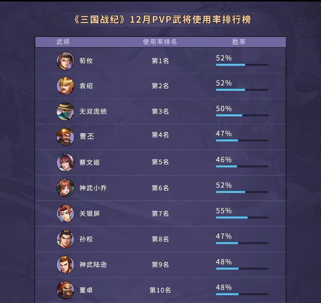 手游的进程是不断创新、衍化淘汰的过程,需要时代的变迁来趋向完善。版本的更迭、新事物的推陈出新、武将技能的优化也成为手游发展的主旋律。在经过最近的两轮武将优化后,不禁然让玩家感慨,手游的确进入一个百花齐放、群芳斗艳的阶段,但也有不尽如人意的地方,PVE无强将可用,玩家只能退而求其次,尽可能开发老武将以求将手里的牌打得更好。有鉴于此,今天我根据12月PVP和PVE武将使用率榜单,为大家盘点当前阶段实力不容小觑的武将。
