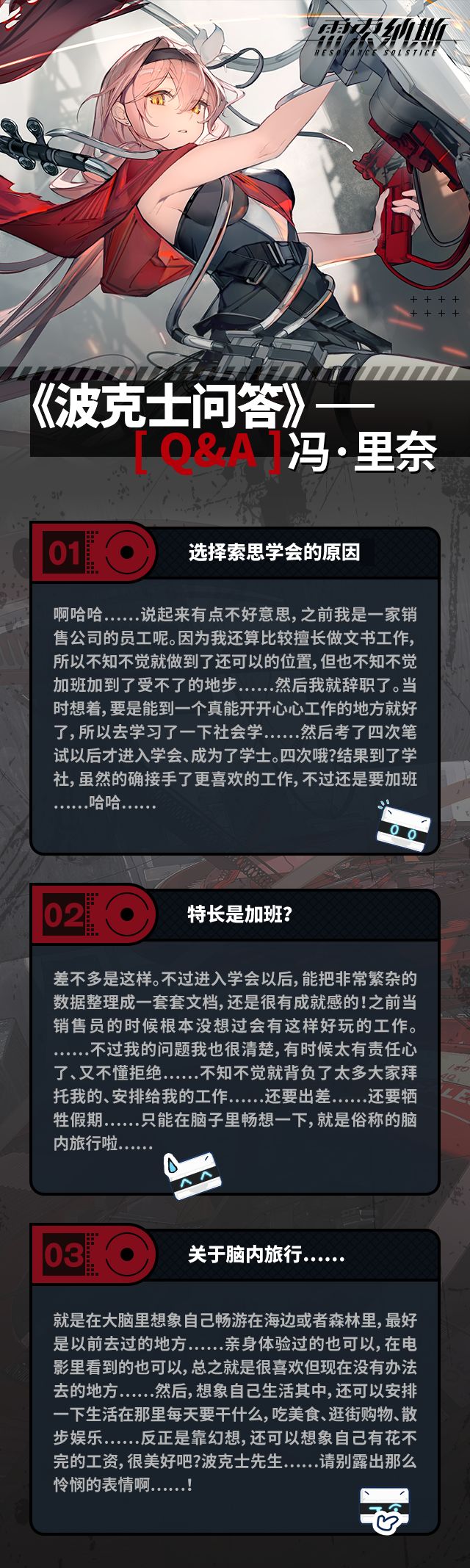 “……咳!我是索思学会的冯里奈,职位是行政主任。目前兼职在无垠号上担任列车护卫队员,也算是列车上的乘客。这里的优点啊……按时下班、不加班、还有很多莫名其妙的休息?”