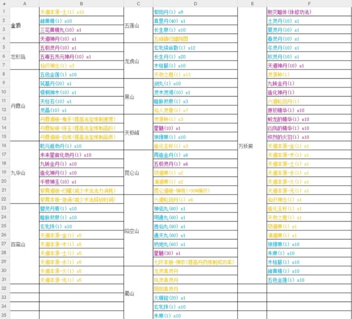 各门派的仓库物品