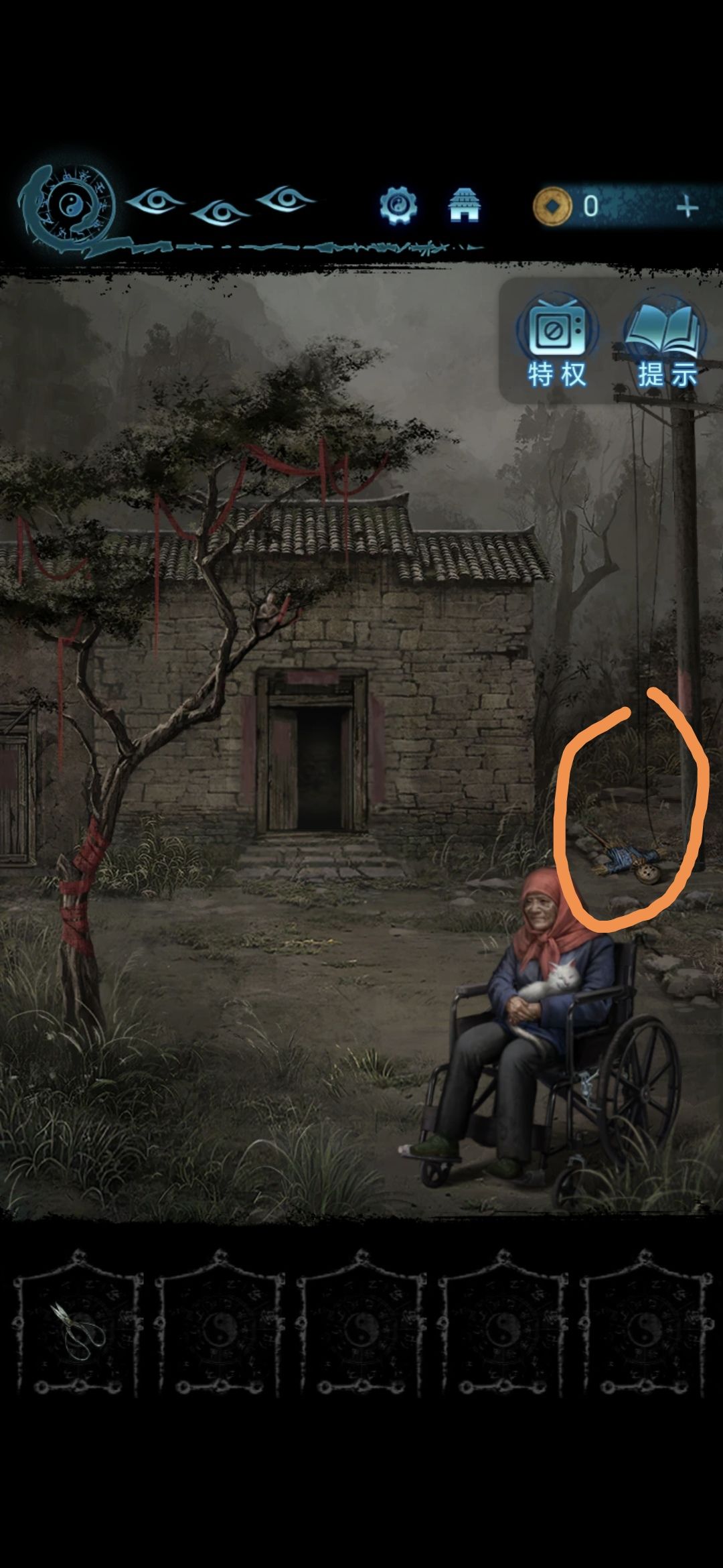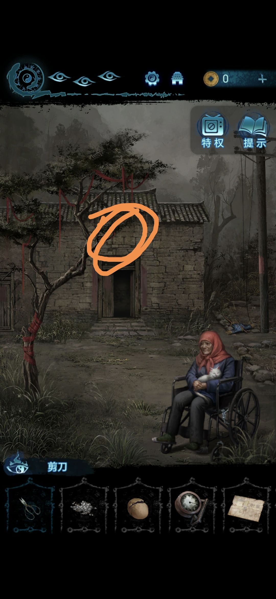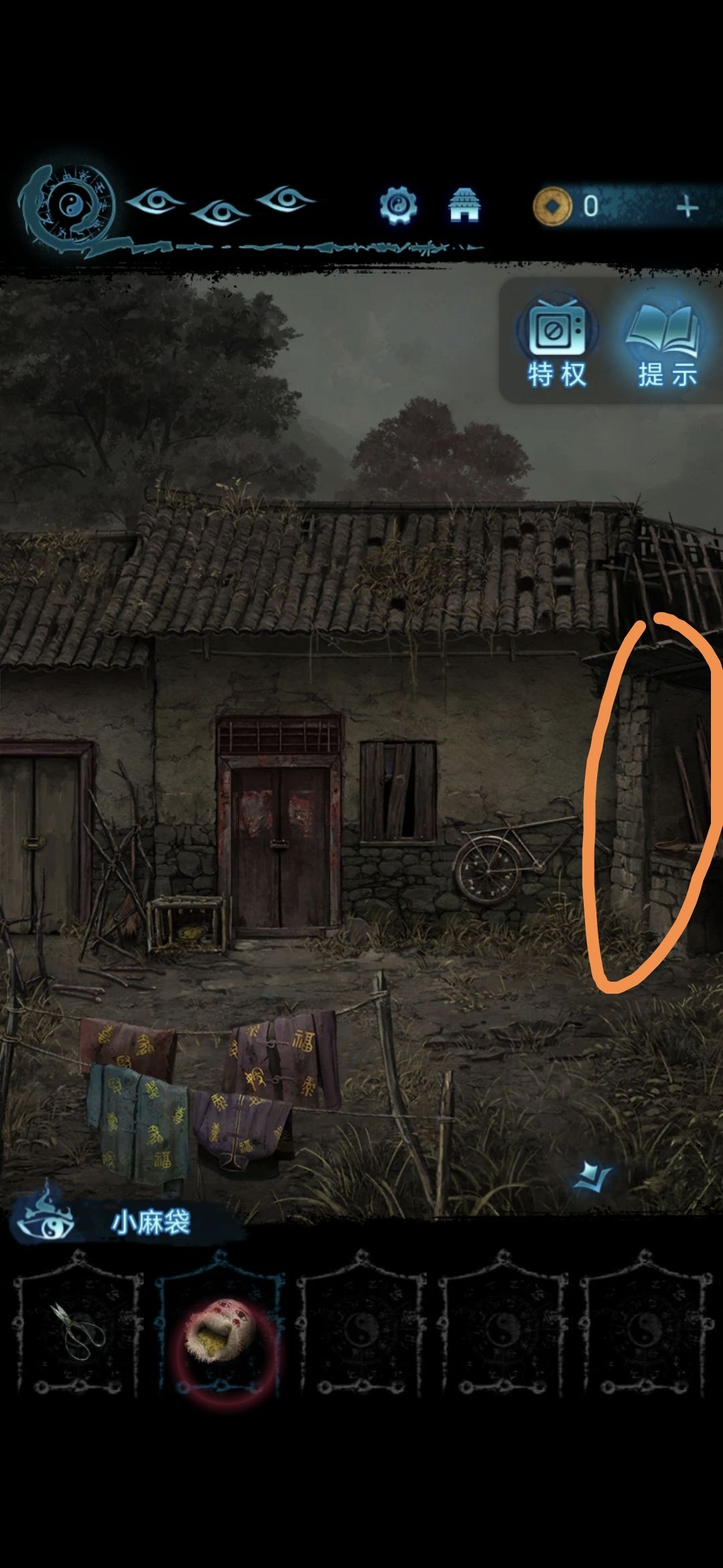 过剧情,点击房子旁边的稻草人,用剪刀剪开稻草人脖子上的绳子,获得小麻袋