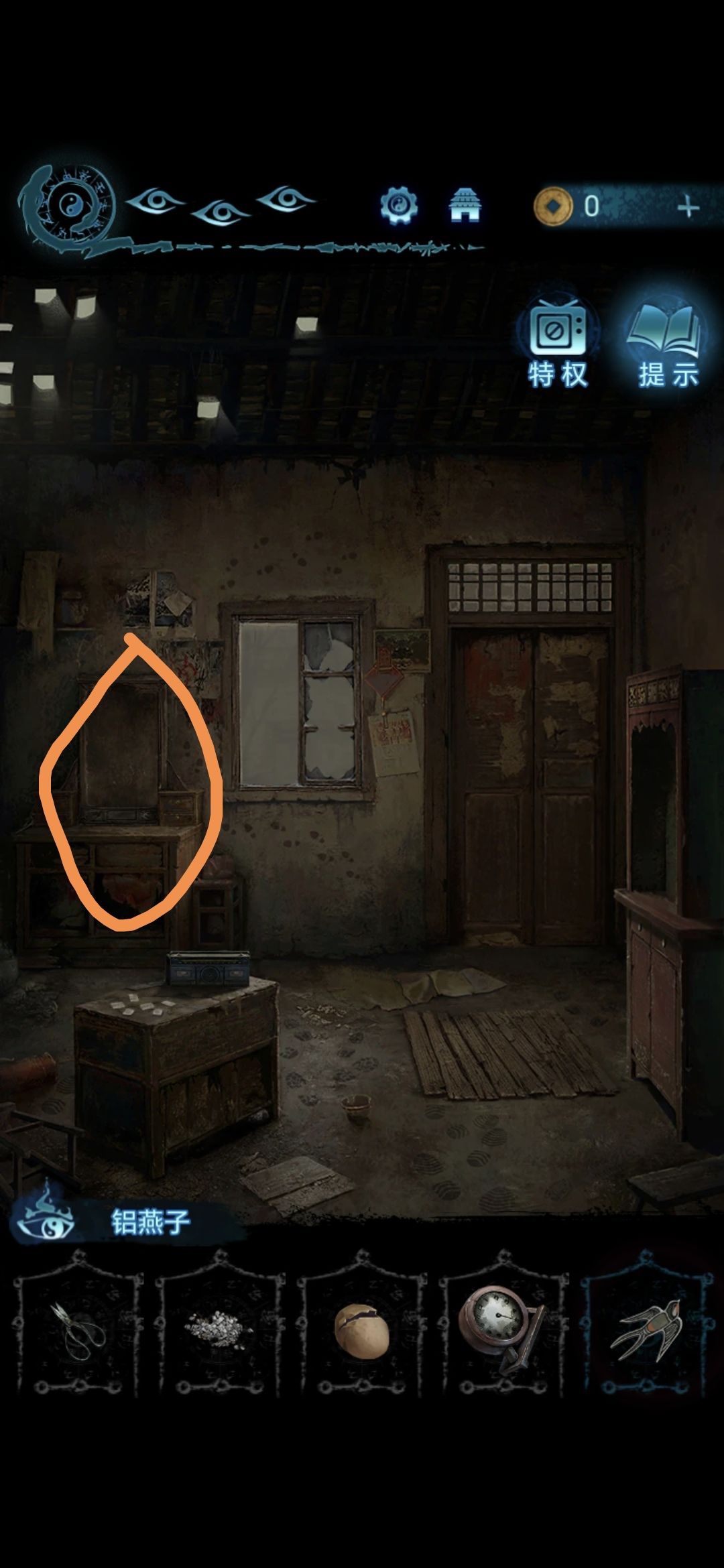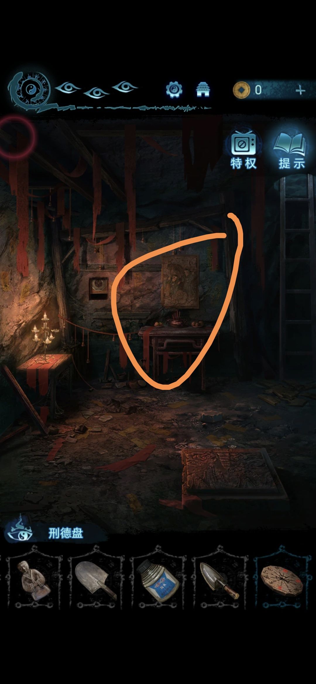 把刑德盘放在肖家底下的供桌上,把蛋壳放在刑德盘上,里面灌强力胶和砂石,再把布娃娃头黏上去,画里扔出书来,翻书,获得金箔