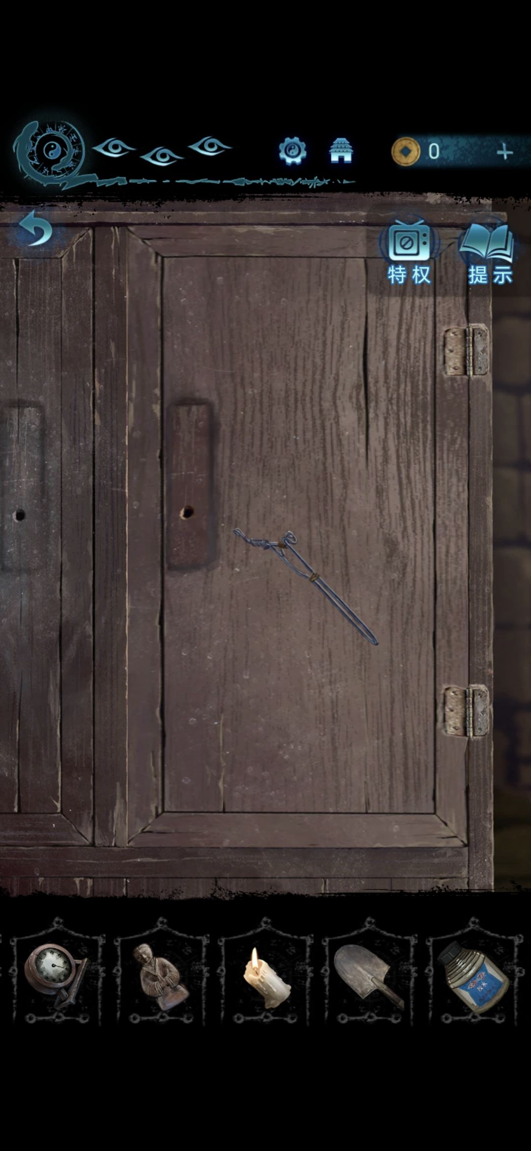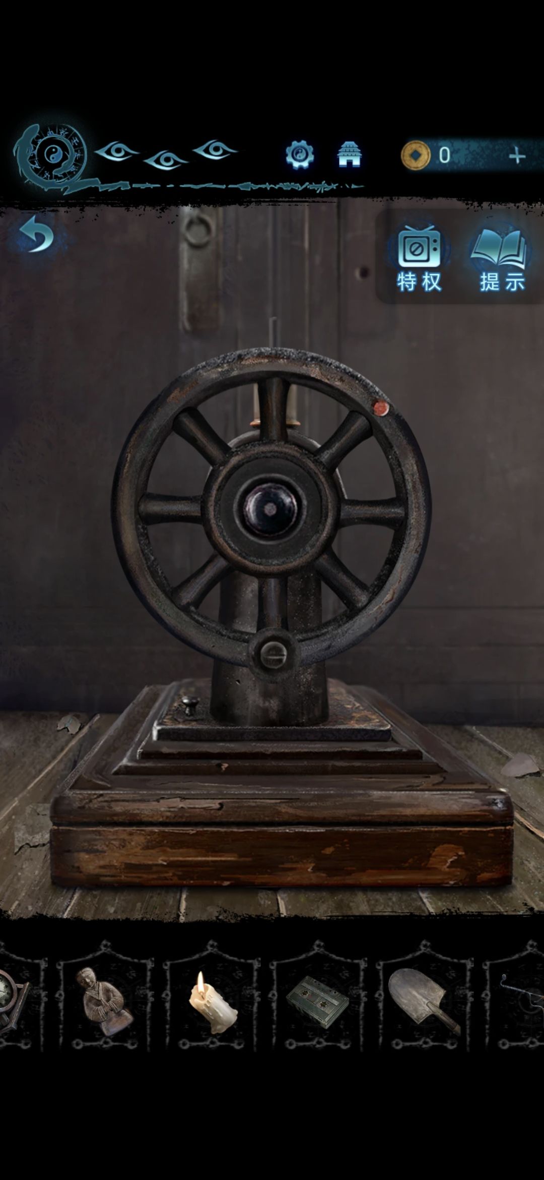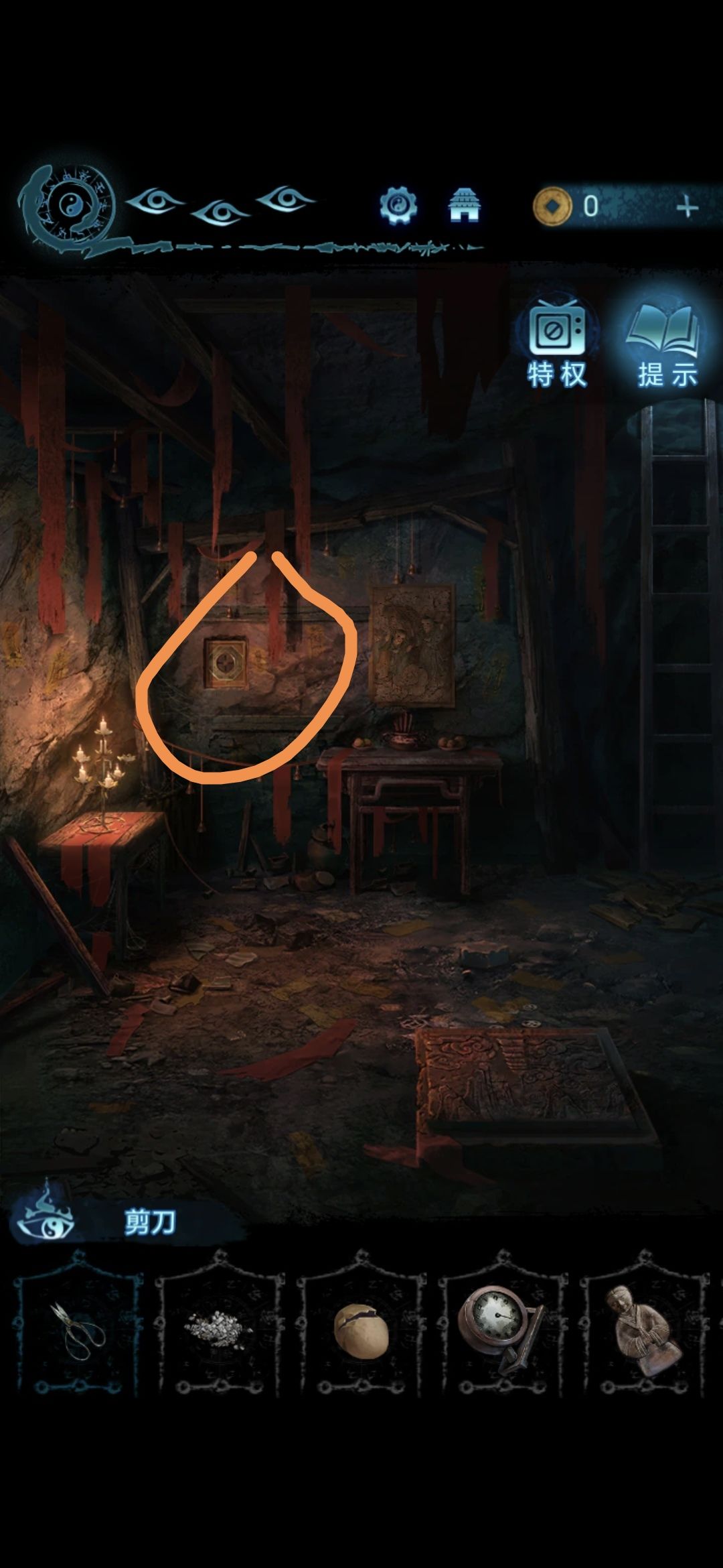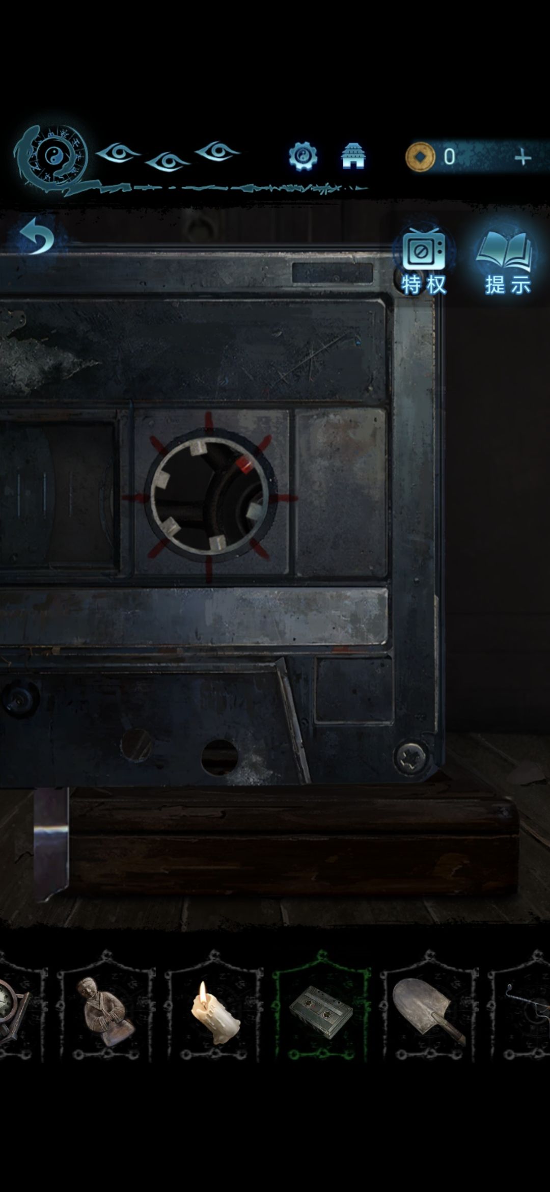 进入肖家地下的房间,把剪刀插进墙上的机关里,获得圆盘