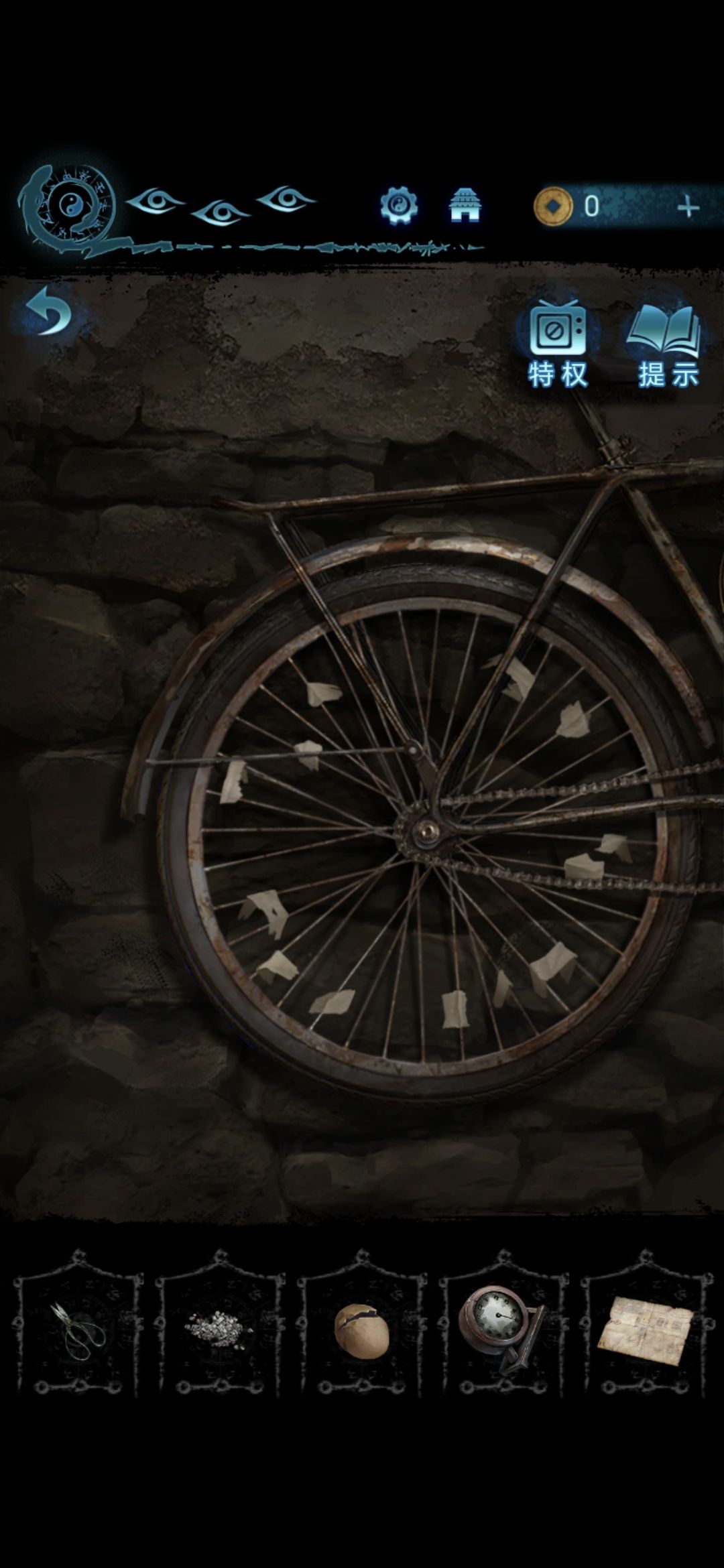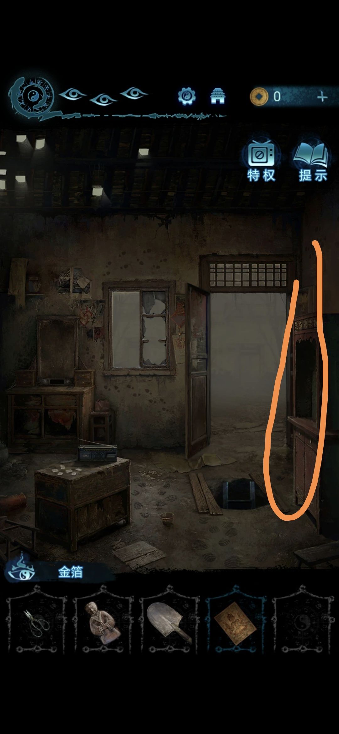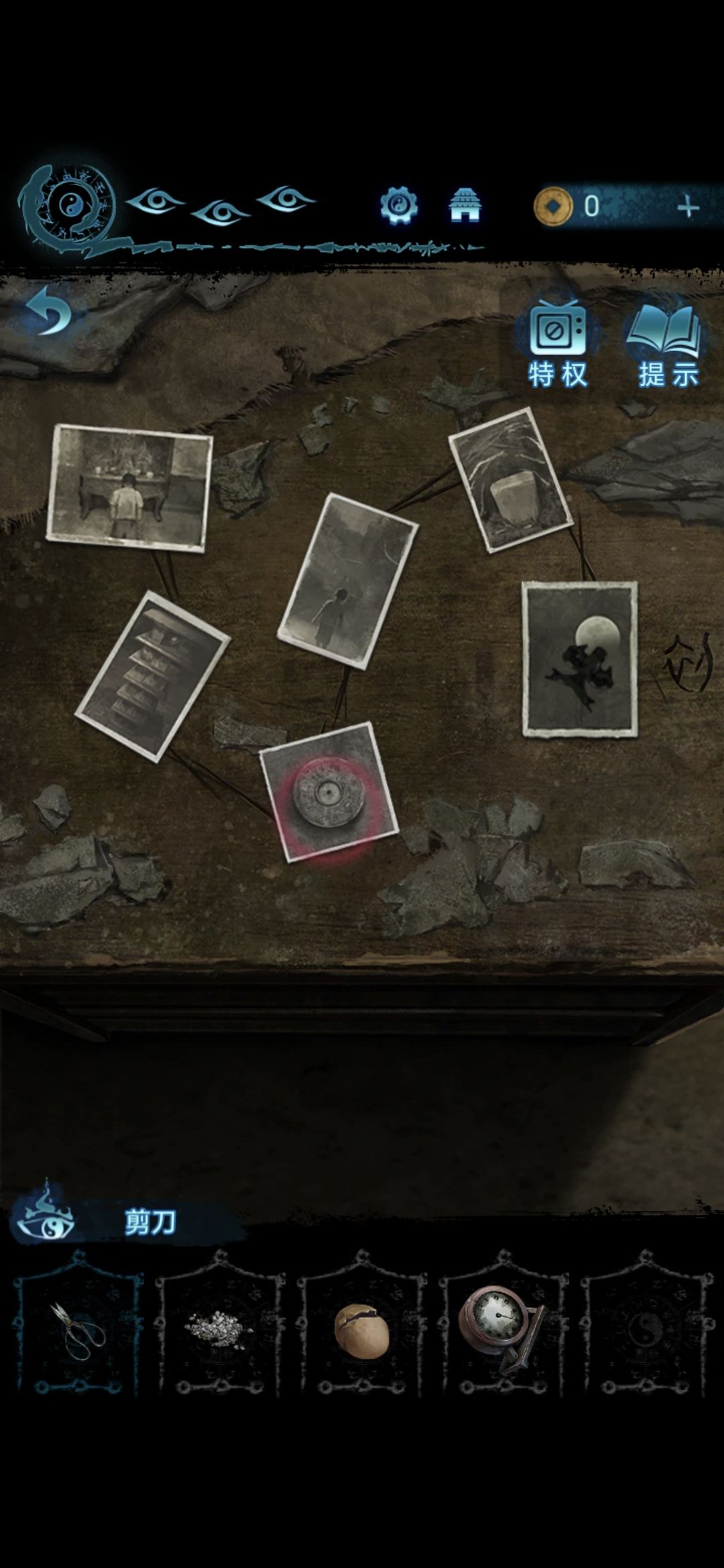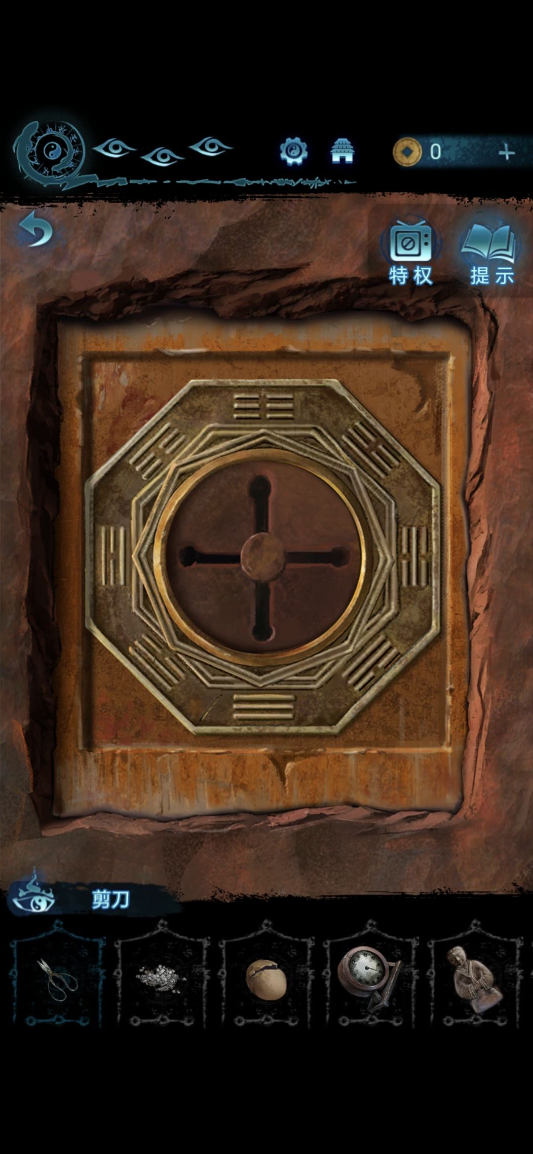 进入肖家地下的房间,把剪刀插进墙上的机关里,获得圆盘