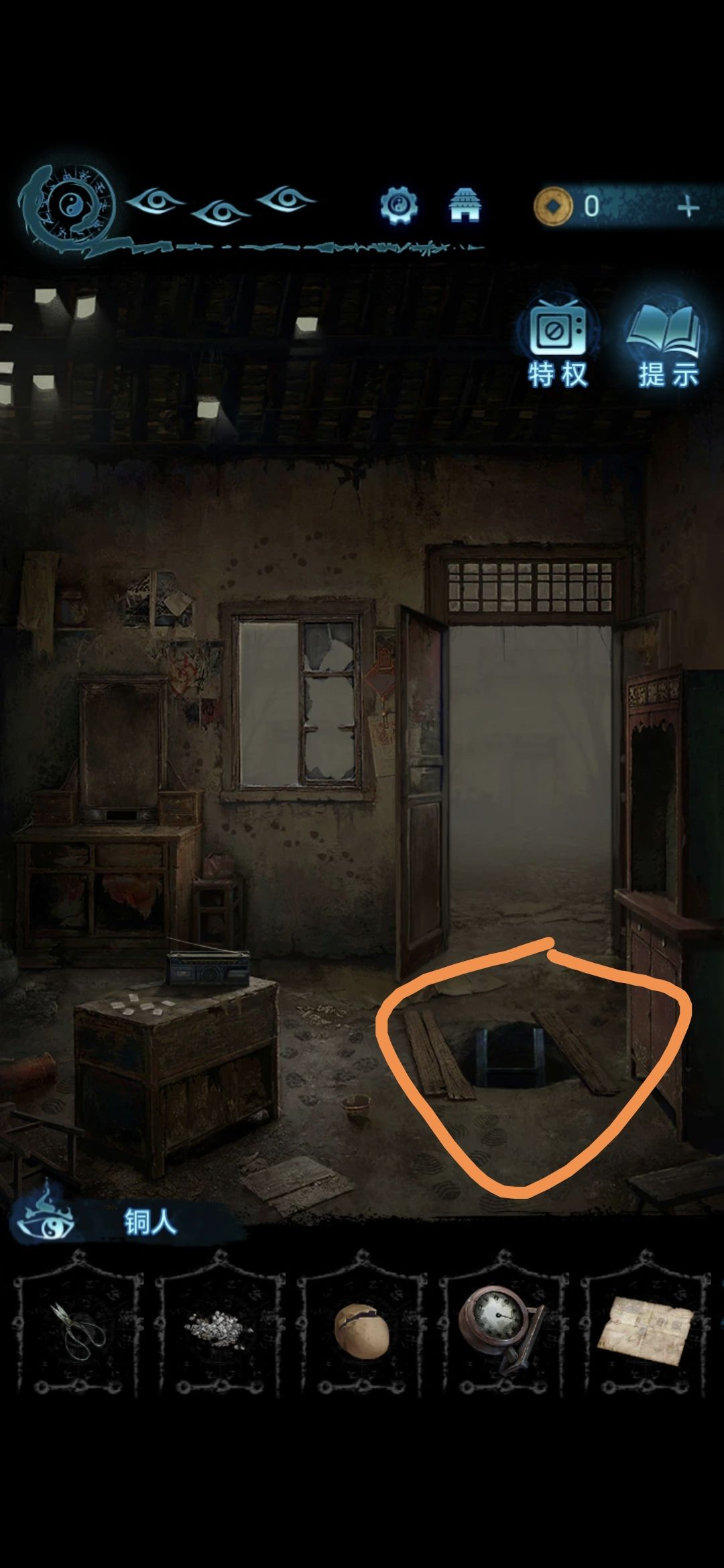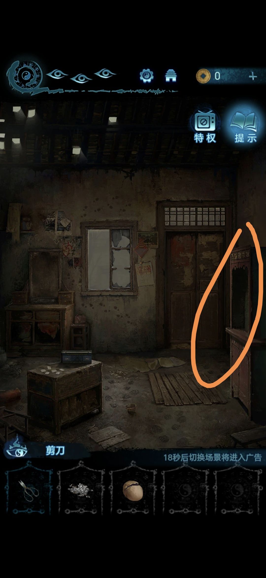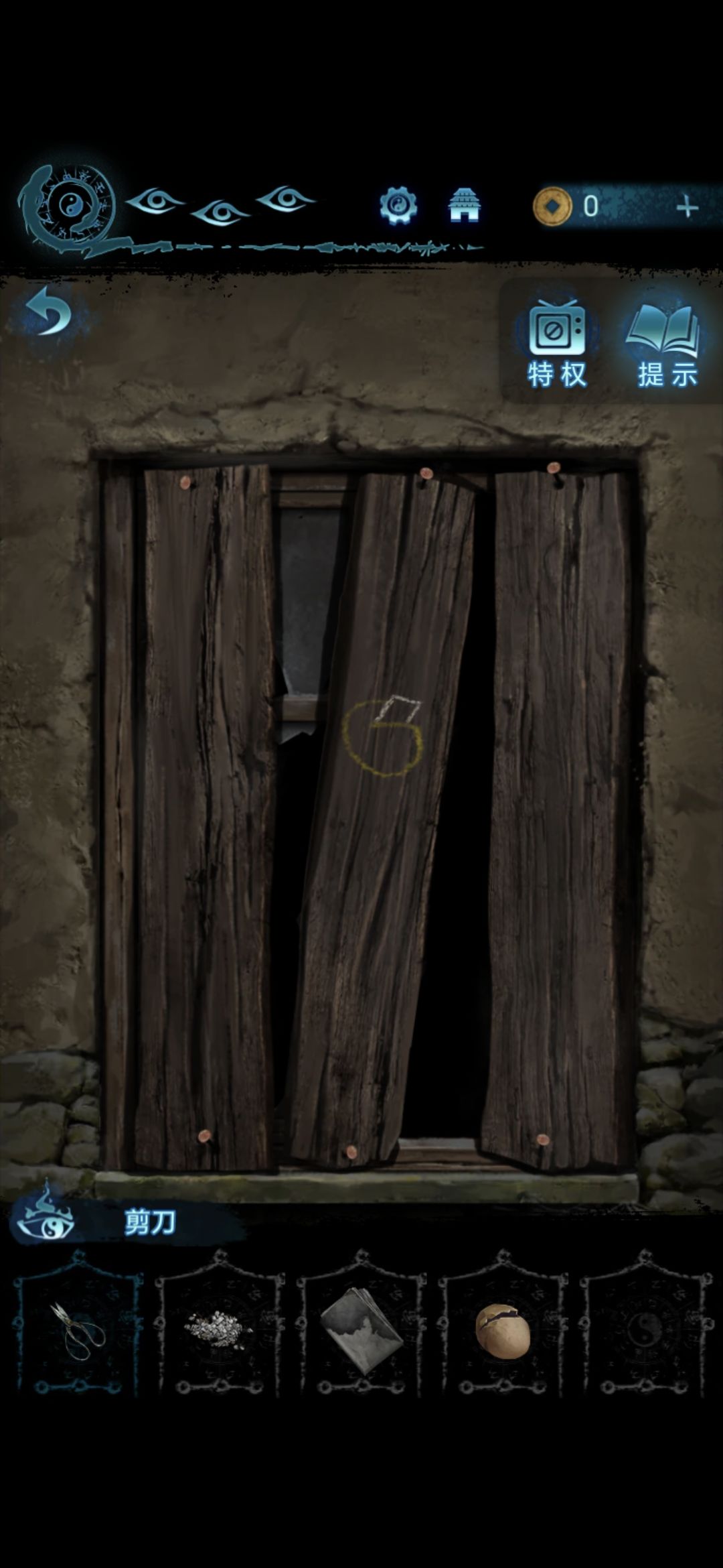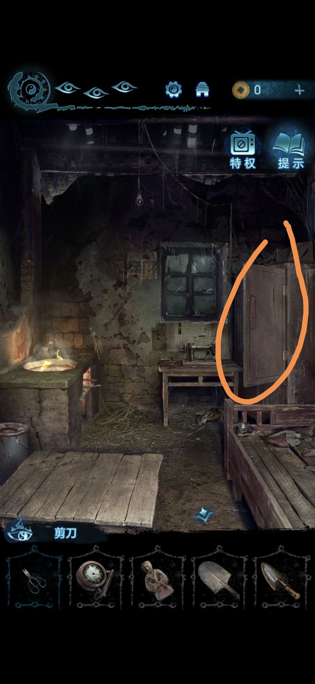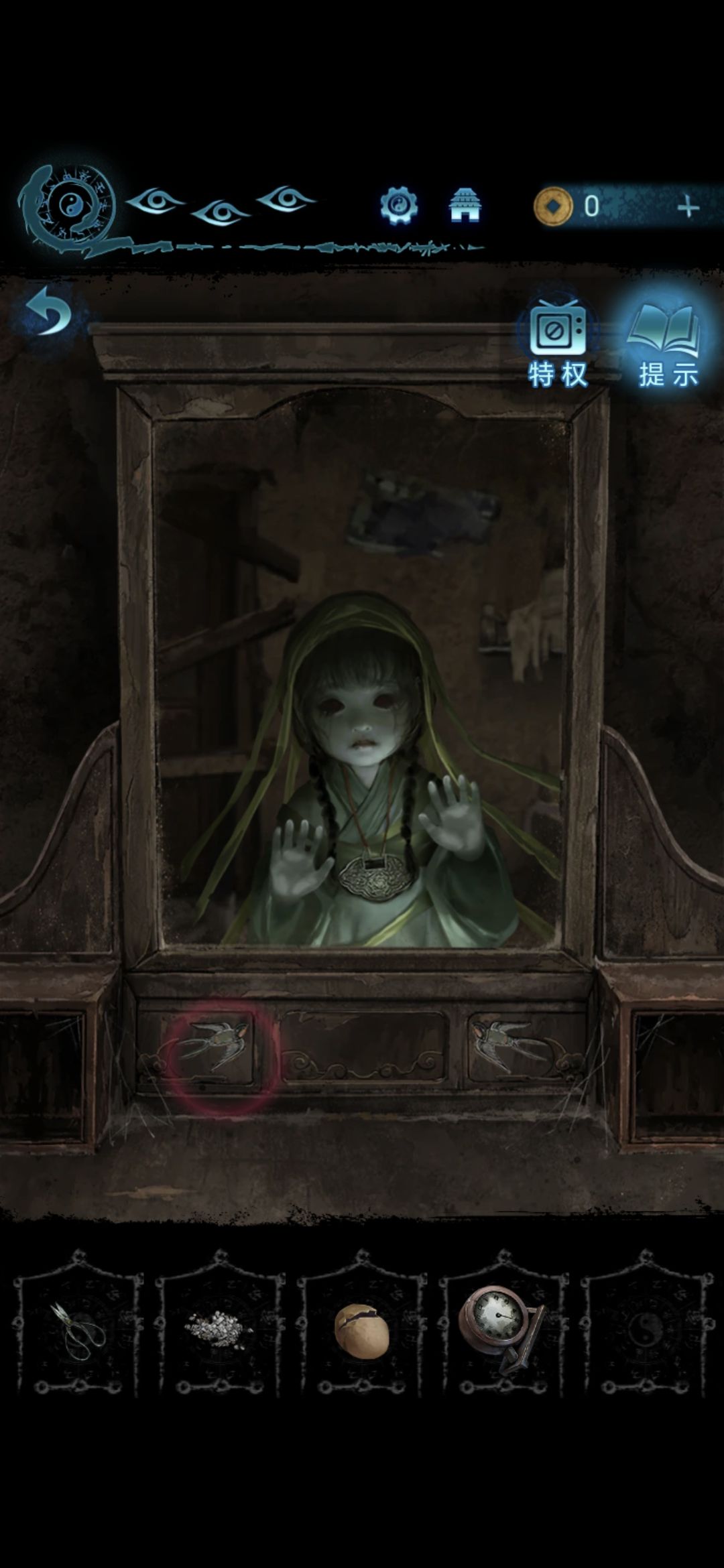 进入肖家地下的房间,把剪刀插进墙上的机关里,获得圆盘