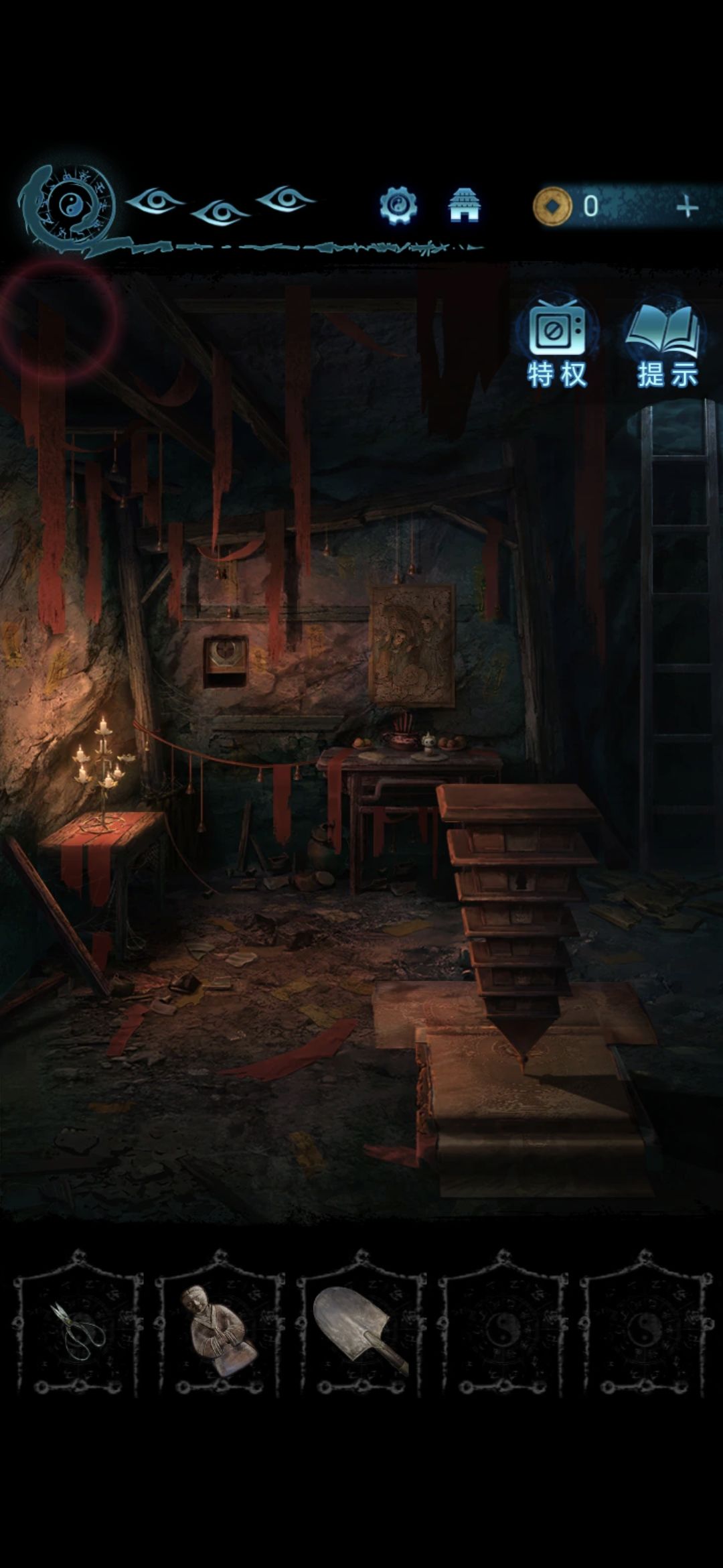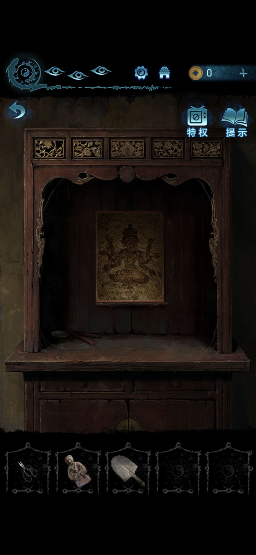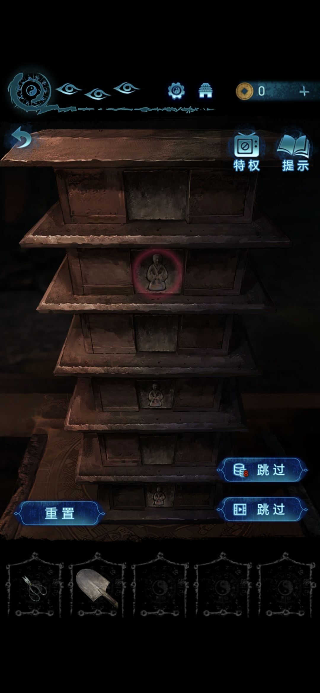 将帛画放在肖家地下的石桌上,将铜人安放在长出来的佛塔上,做小游戏,让每一层都有小人,做完用铁锹拨弄卡住的机关,拨完获得八卦镜