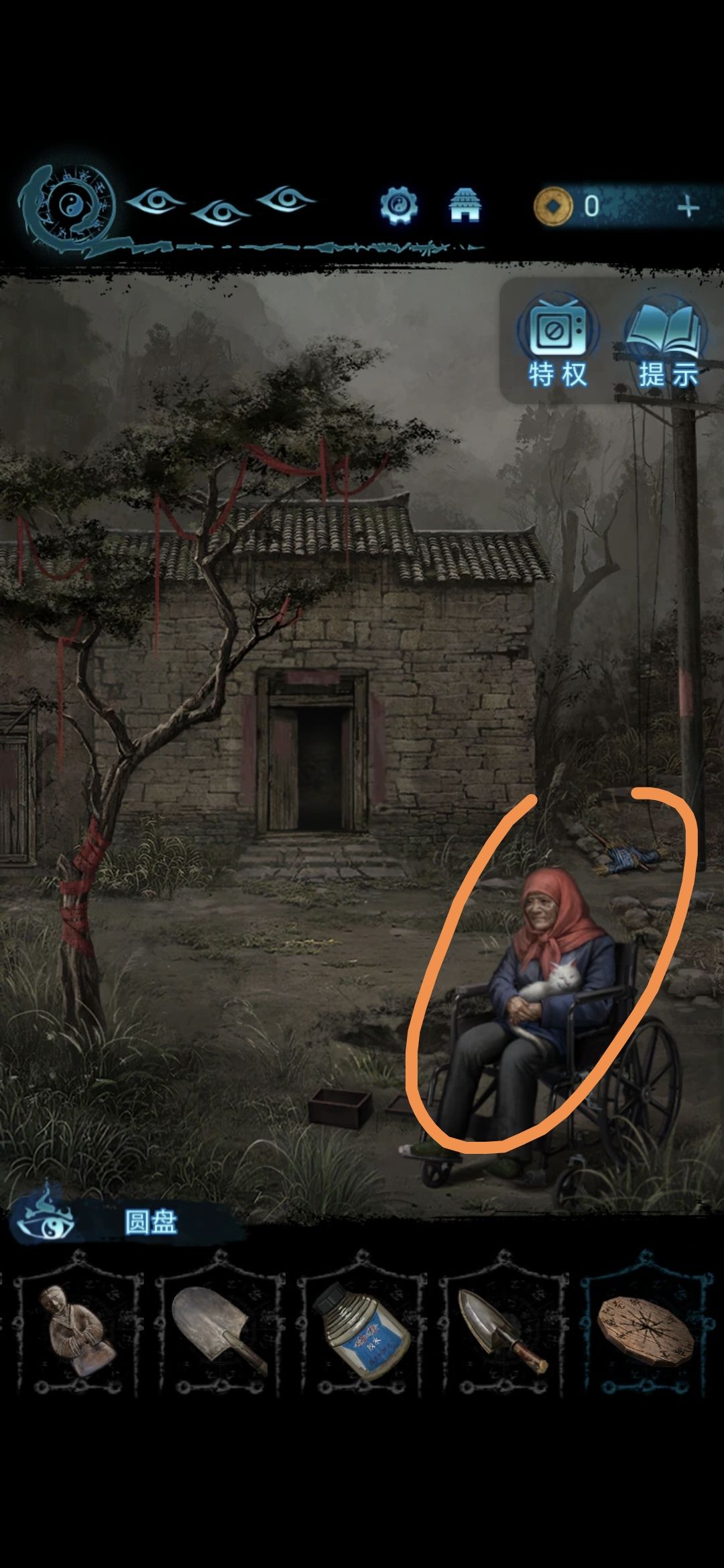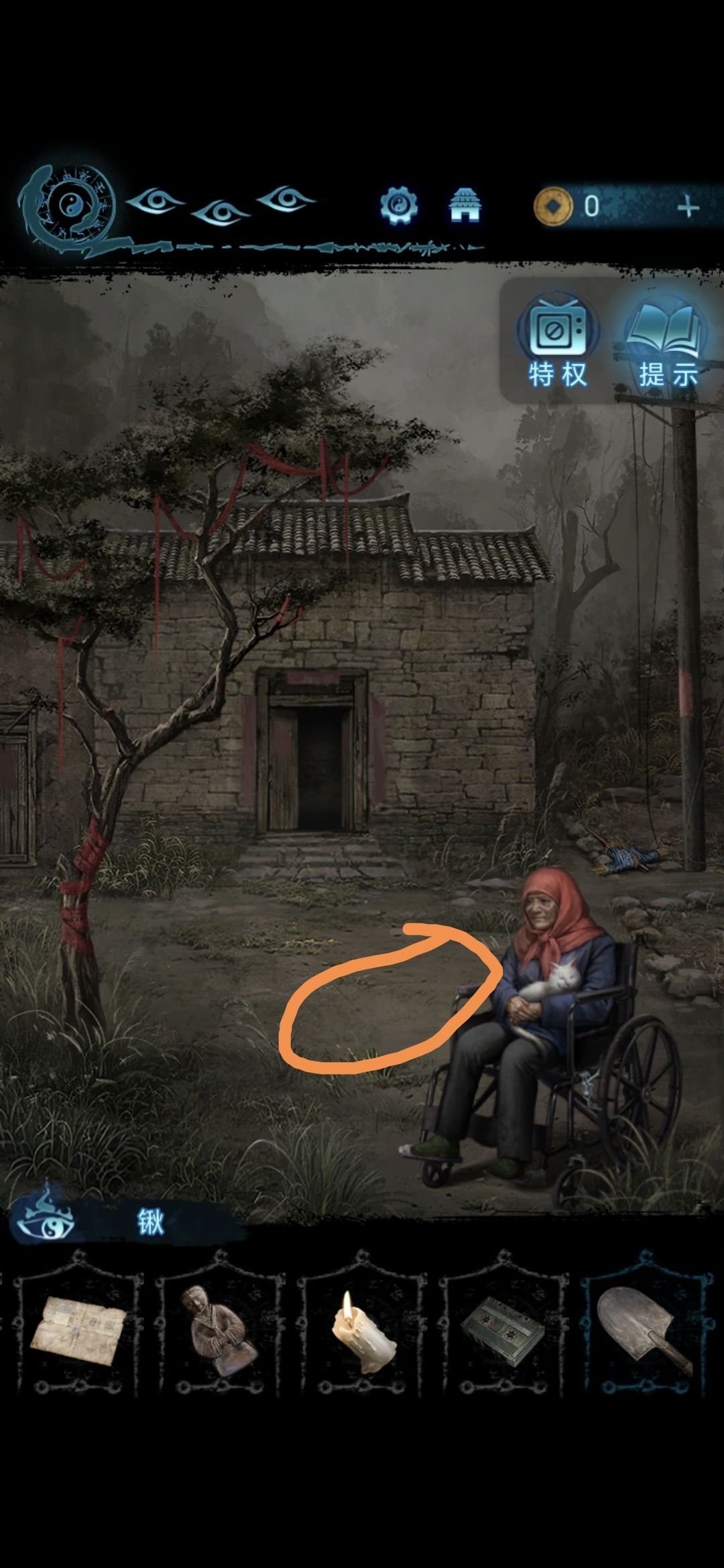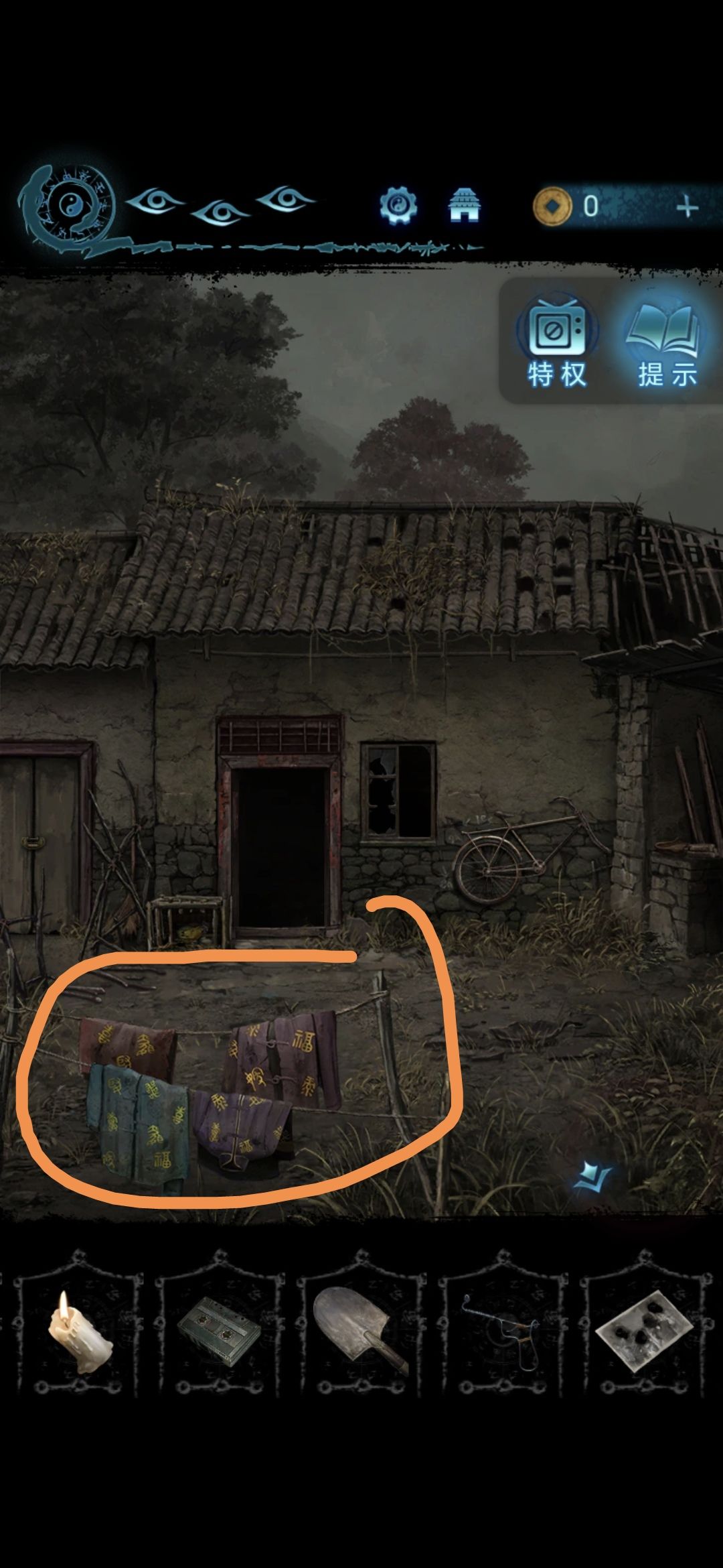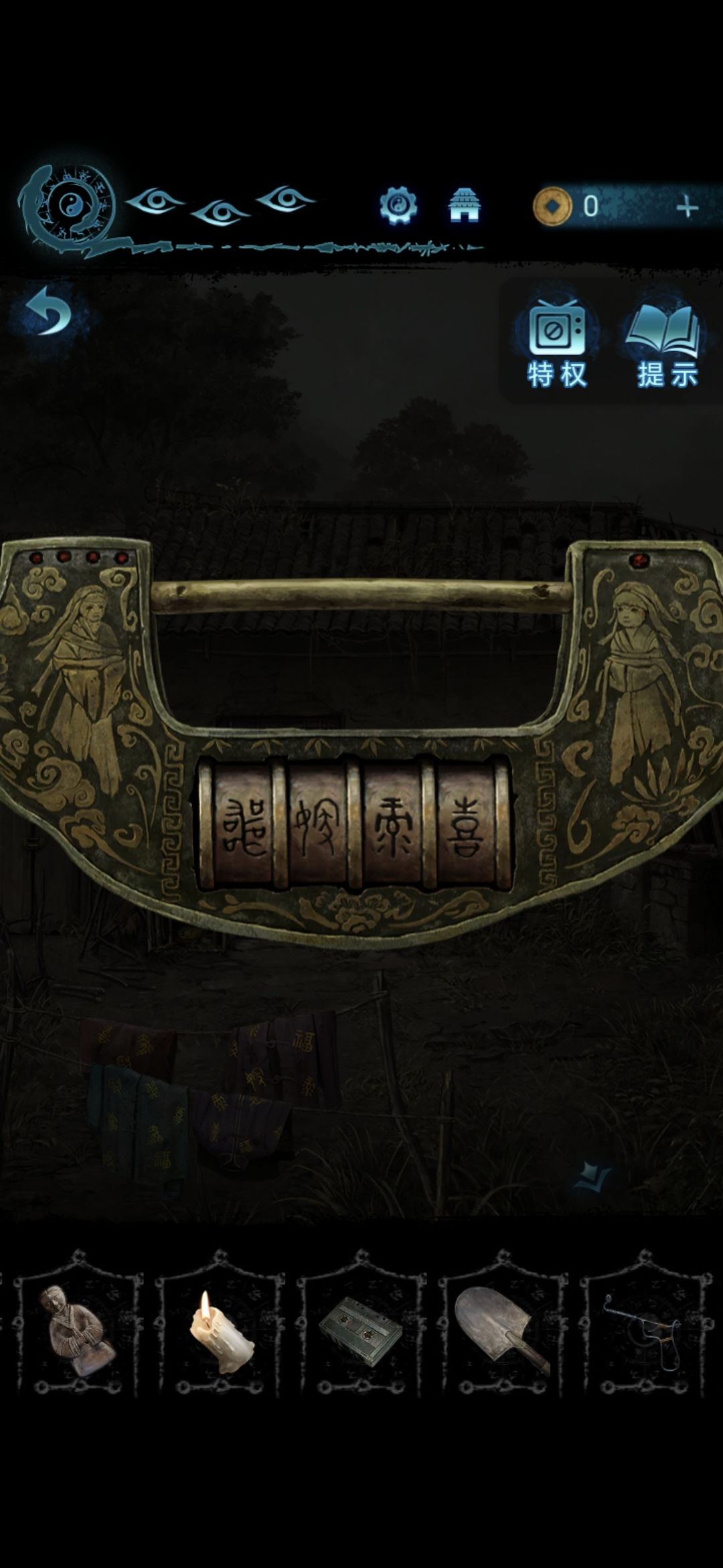 将帛画放在肖家地下的石桌上,将铜人安放在长出来的佛塔上,做小游戏,让每一层都有小人,做完用铁锹拨弄卡住的机关,拨完获得八卦镜