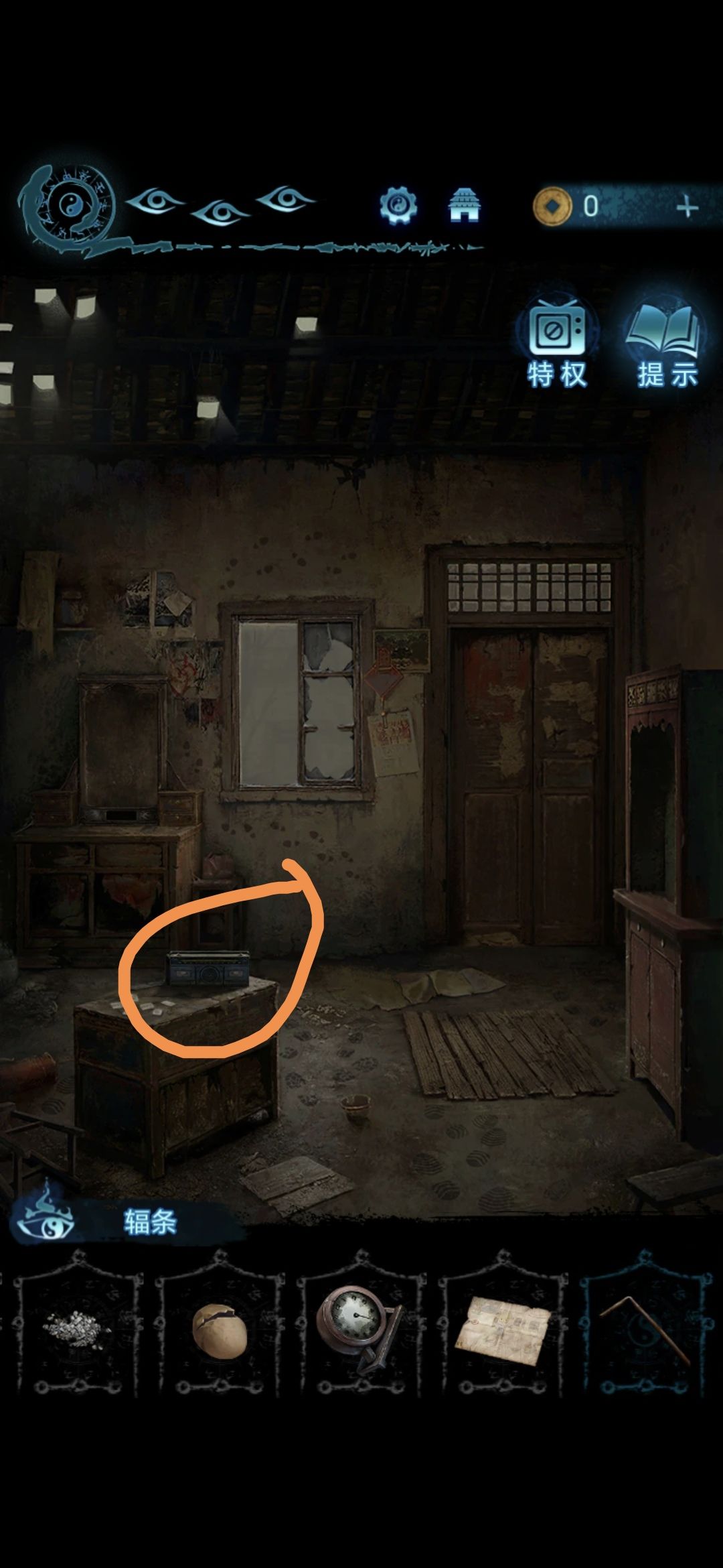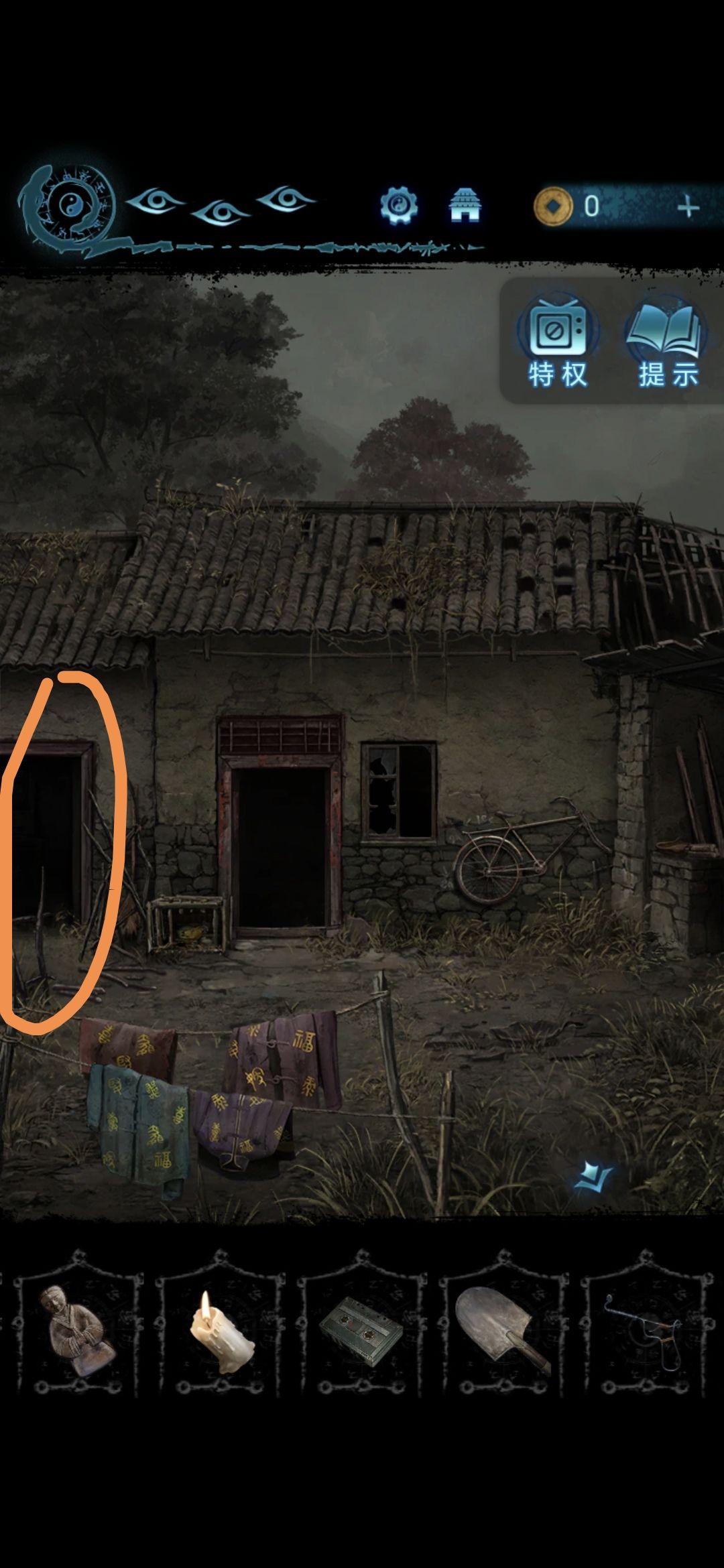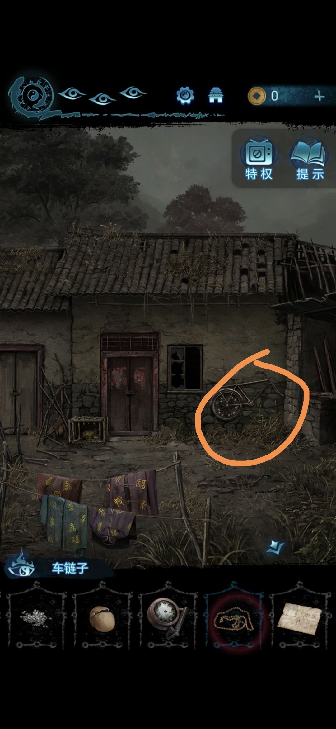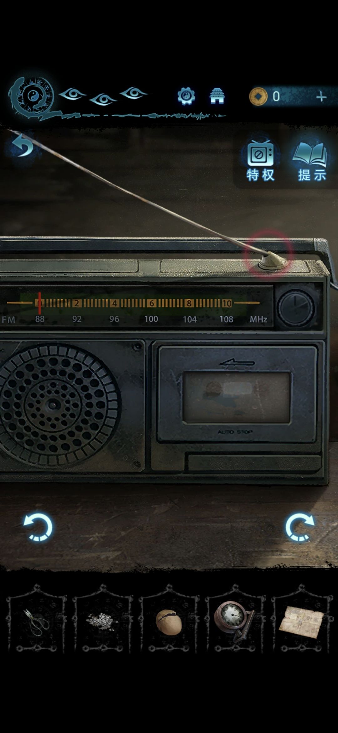 把辐条插在房间内桌子上的收音机上,根据自行车墙上给出的提示切换音频(104→94→89),过剧情,点击婆婆场景里的树枝,获得铜人