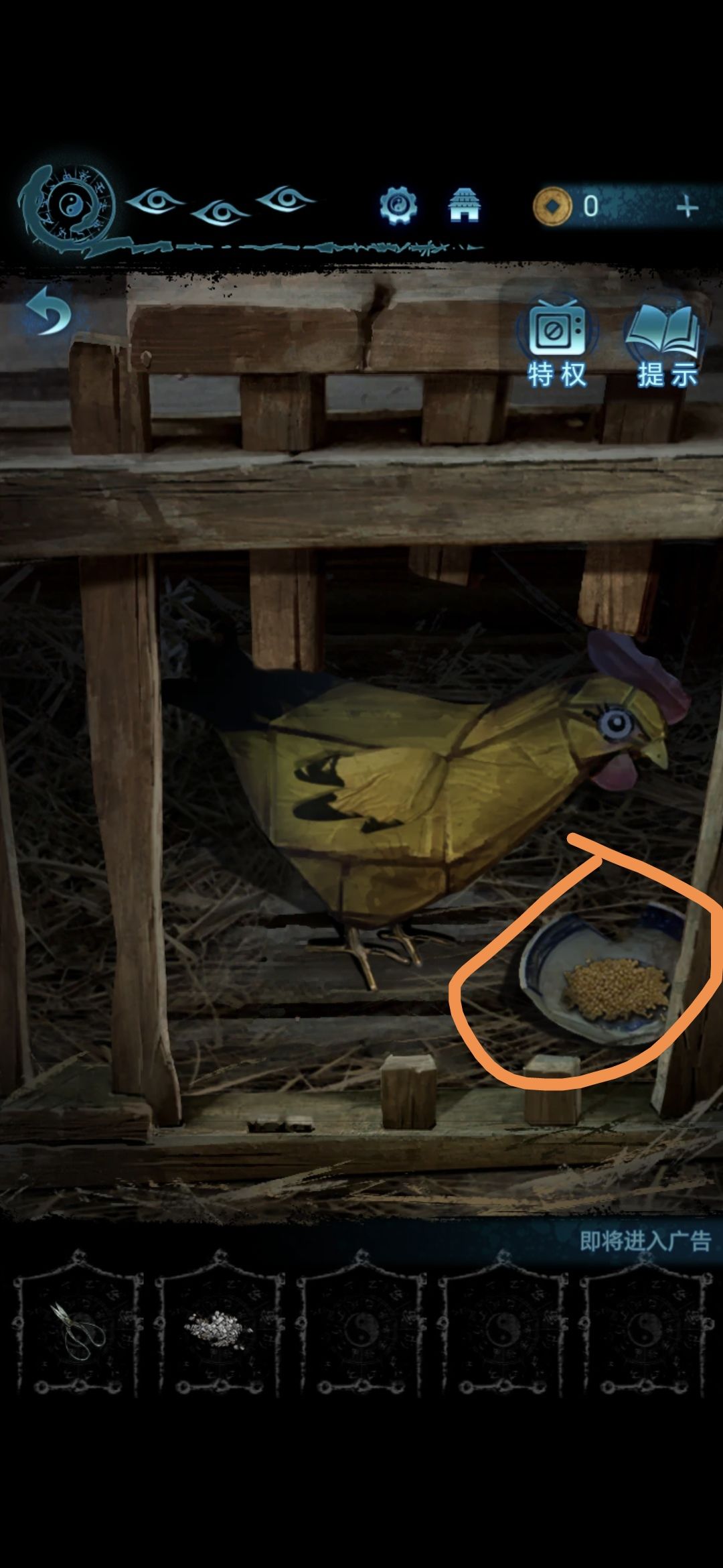 房门左侧的鸡笼里有一个空碗,把小米倒进空碗里,获得诊断书和蛋壳
