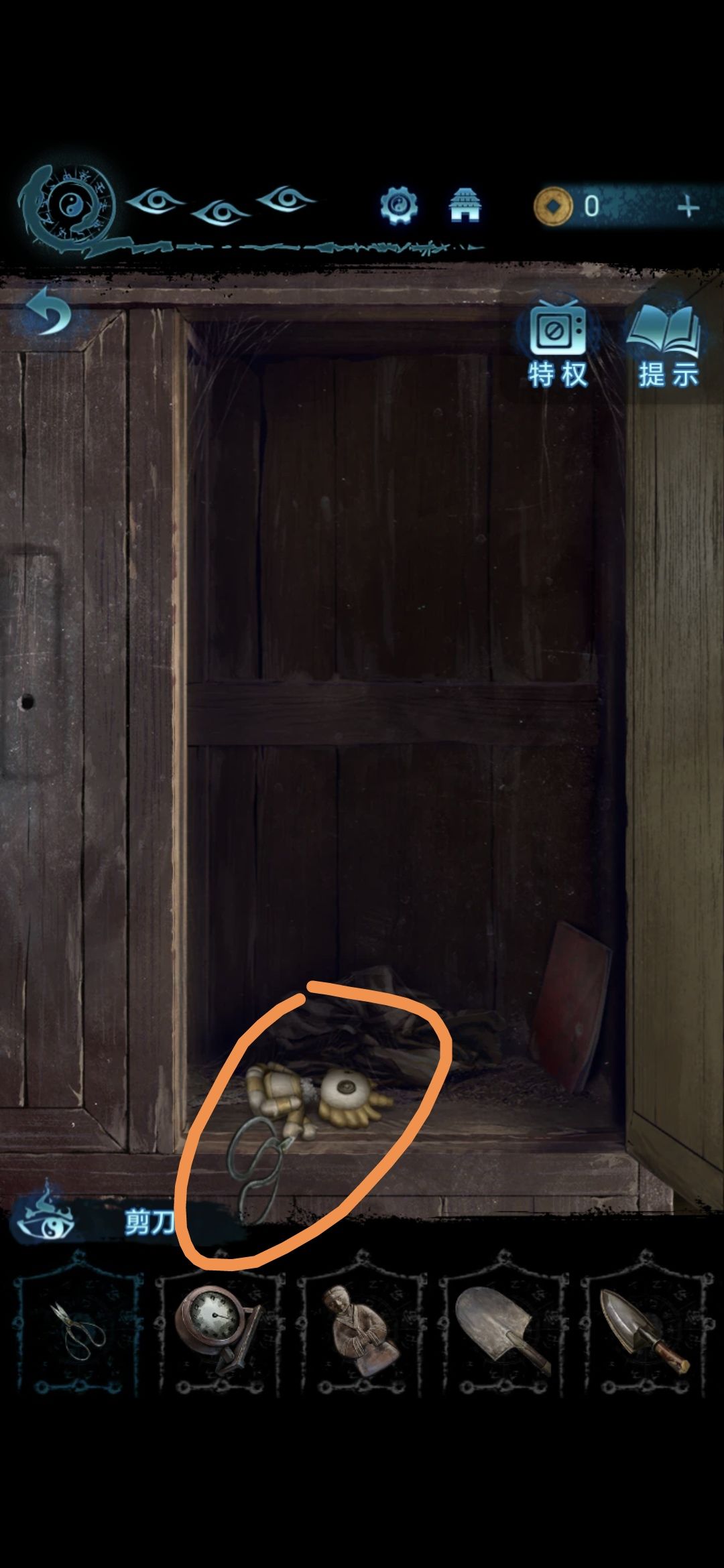 用剪刀剪下奚家柜子里布娃娃的头,获得布娃娃头