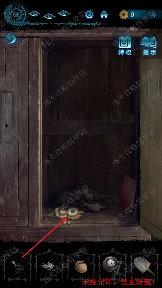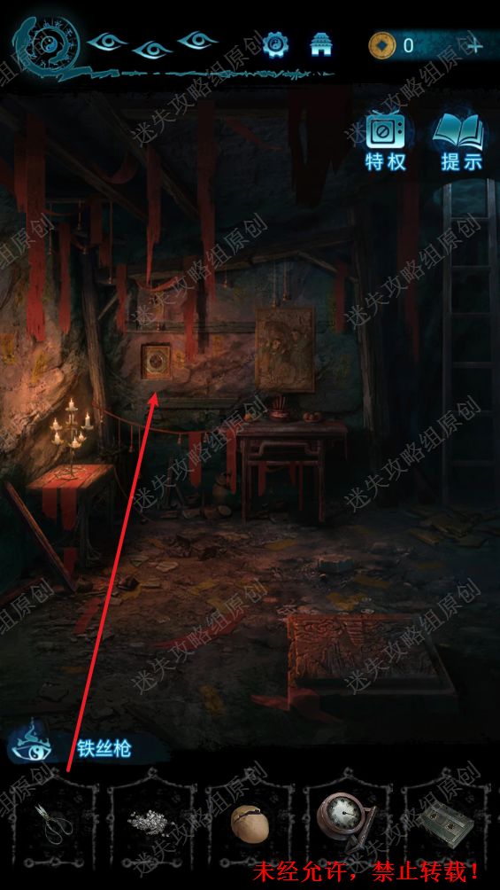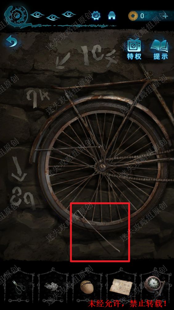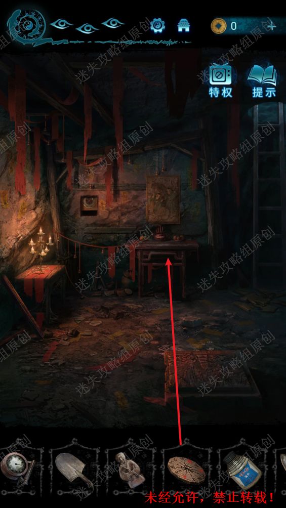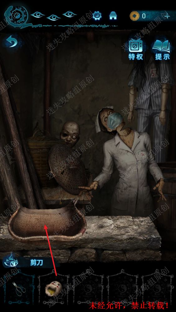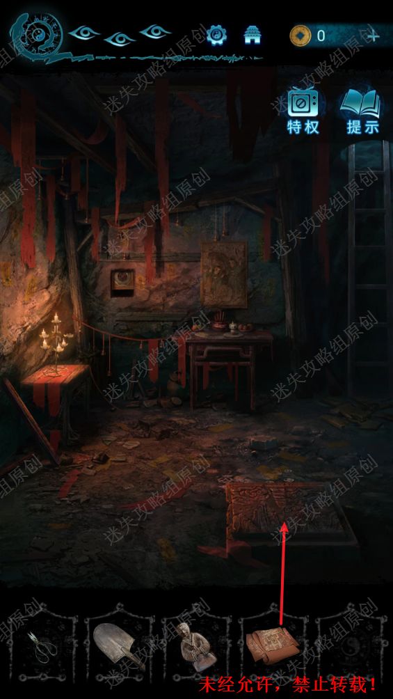 78.点击洞口进入到地下室,使用剪刀打开墙壁上的机关,获得圆盘。78.1
