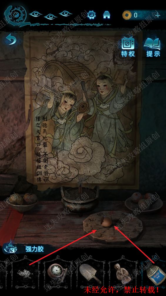 86.来到地下室,点击桌子,将圆盘,蛋壳放入到桌子上。86.1