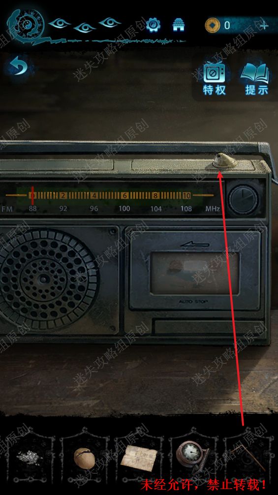 74.进入到屋子里面,点击收音机,将辐条装到收音机上,按照104、94、89依次调试收音机,获得磁带。74.1 74.2