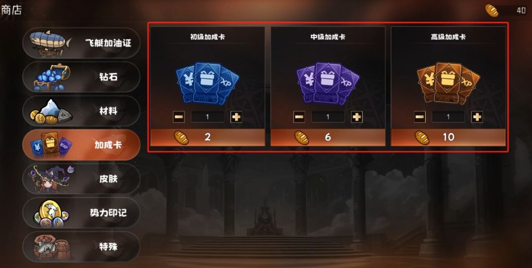 A:用不完的体力可以去商城兑换为加成卡,在冒险中使用加成卡会增加获取的经验、装备和材料,相当于一把顶N把,可以根据自己的实际情况来决定如何使用体力。