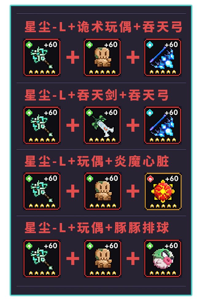 心脏+玩偶套:炎魔心脏由于属性的问题会导致以后属性搭配很头疼,但是和玩偶搭配的伤害还是不俗的。(呱呱木战就钻研这东西,所以并不是胡说)