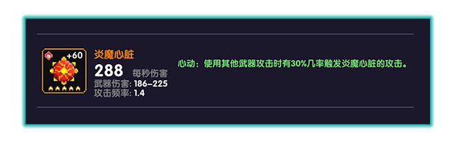 炎魔心脏:它的佩戴理由和诡术玩偶道理一样,副手携带30%触发心脏攻击,也同样算作普攻。而且和娃娃不冲突可以同时使用,获得更高的攻速上限。唯一美中不足的是个橙武,武器属性很低且没有木攻没有穿透,非常依靠其他属性。(有时候我就在想什么时候能出个不与玩偶冲突的类似心脏效果的红色武器)