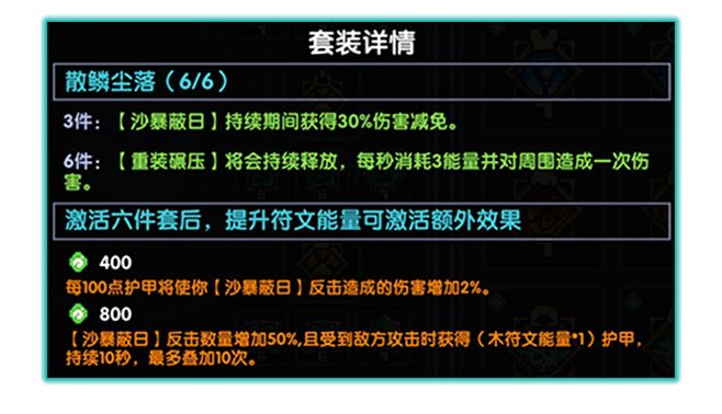 注意点1:激活散鳞尘落3件套并不会有明显提升(需要魂卡冷却达到一定数值才会保持一个安全的减伤效果。而6件套激活的持续释放重装碾压可以说是过度前期的大提升,减伤与伤害都很可观)