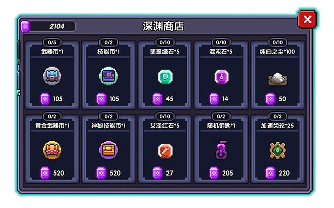 深渊狩猎深渊商店:通过每日挑战深渊狩猎、深渊裂隙排行榜获取深渊碎片(兑换币)兑换优先级:前期视自身情况兑换武器币、翡翠绿石、混沌石、加速齿轮,中后期兑换加速齿轮、翡翠绿石、随机钥匙、多余兑换武器币。(深渊宝箱属于版本淘汰品,不需要兑换)