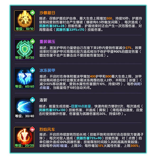 注意点1:除了冰冻装甲可以升满星以外,连斩、重装碾压、烈焰风车适度升星,沙暴蔽日绝对不能升星。因为你要为以后锤战的双橙技能积攒升星材料。不要浪费在过度技能上。