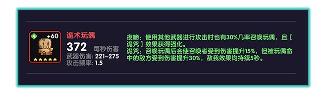 诡术玩偶:主流锤战佩戴里一直都绑定这把武器,理由就是普攻可以30%几率触发召唤玩偶,而玩偶又算作普攻,锤战普攻又算作技能,又可以激活星尘-L与符文效果。简而言之就是攻速上限4.0,而娃娃可以超越攻速上限,从而释放更多的陨击技能。(顺便提一下,木偶对怪物的增伤30%虽然是独立计算,但不管是组队还是单刷,其实可以忽略不计。原因就是锤战是远程输出,高额恢复但是减伤很少。你不可能一直在怪物身边测来蹭去的,特别是弹幕过多的BOSS身边。组队的话也有队友帮忙带玩偶共享BUFF)