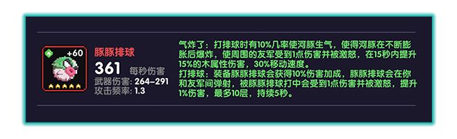 豚豚排球:如果仙王武器出的在晚一点,那么满大街锤战都是在用河豚了。河豚拥有20%的增伤和15%的元素伤害,在单打的时候效果挺好的,唯一不足的就是气炸了效果老是影响走位。那么现在很少人带了一是因为仙王强大的效果加成,二是组队的情况下队友可以携带。所以优势并不是很理想,当然也有做数据的专门推算过河豚的伤害优于玩偶+仙王弓。
