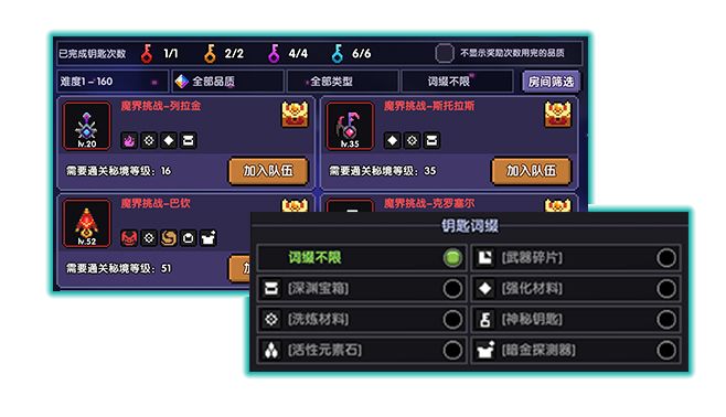 注意点1:尽量重铸蓝色与紫色钥匙(节省金币),当刷到任意以下词条:强化材料120%以上,活性元素石10个以上、神秘钥匙。就可以停止并享用了。