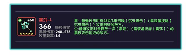 星尘-L:没有这把武器就不是锤战了,这把武器的效果直接与技能和符文联动。通过普攻百分百触发震荡1下(震荡技能释放一次是10下),普攻也会有25%的几率触发陨击技能。这样就可以说明为什么锤战需求攻速了,攻速越高被动释放的震荡和陨击就越多。同时还加强了符文6件套效果。