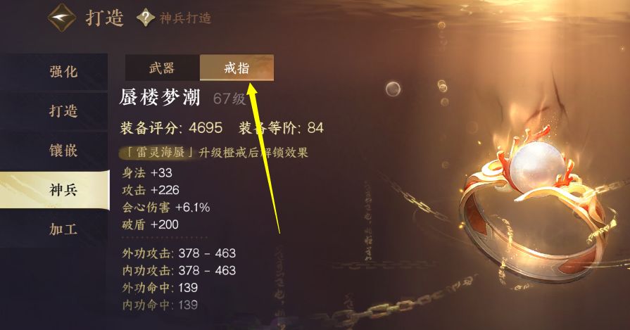 获取方法:首先大家在【打造】界面,找到神兵,再点击戒指,