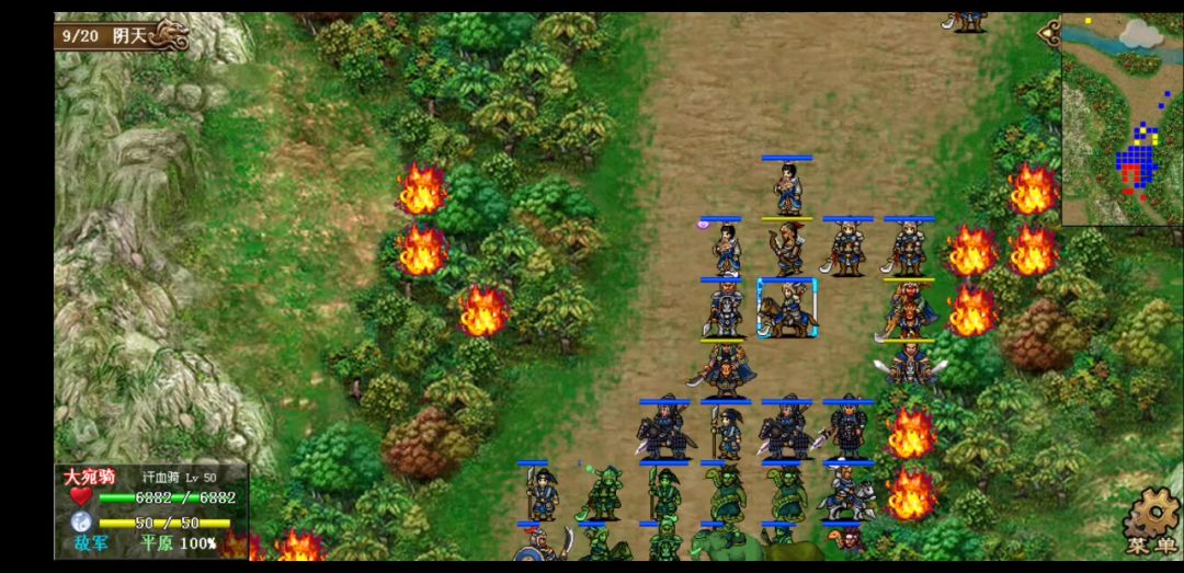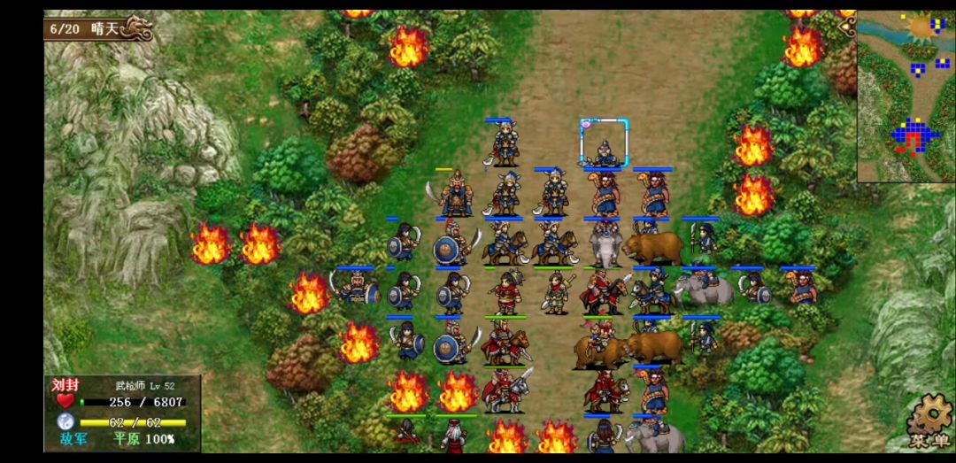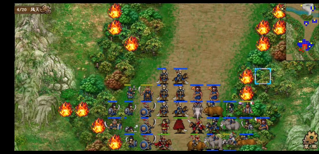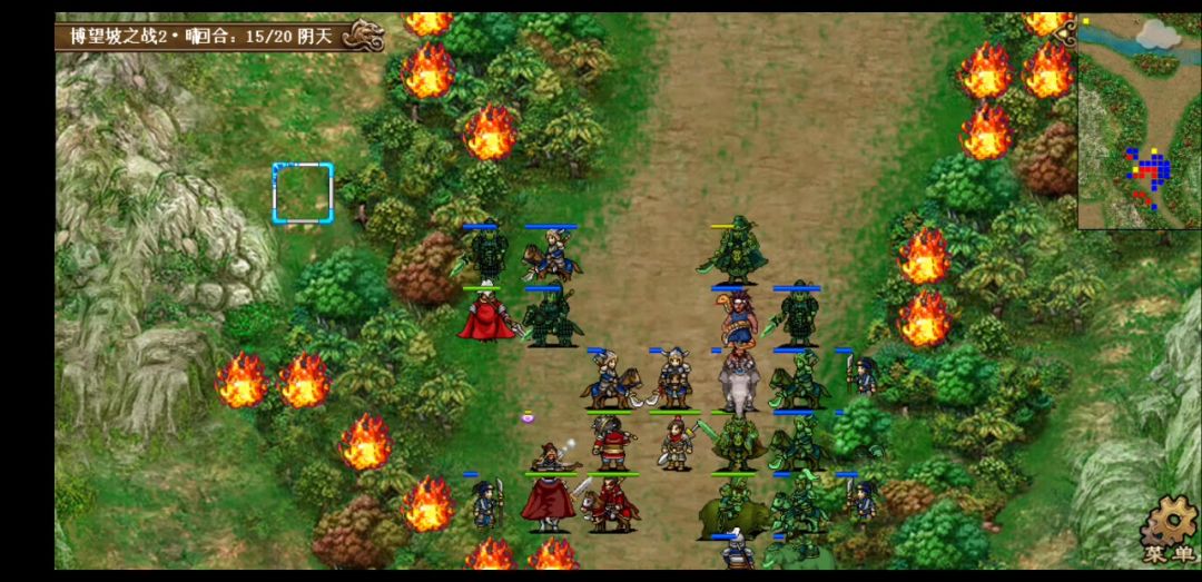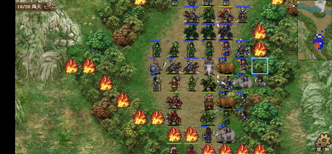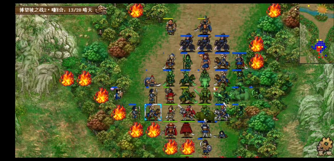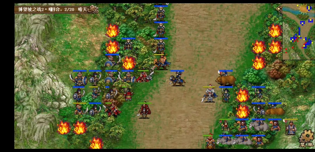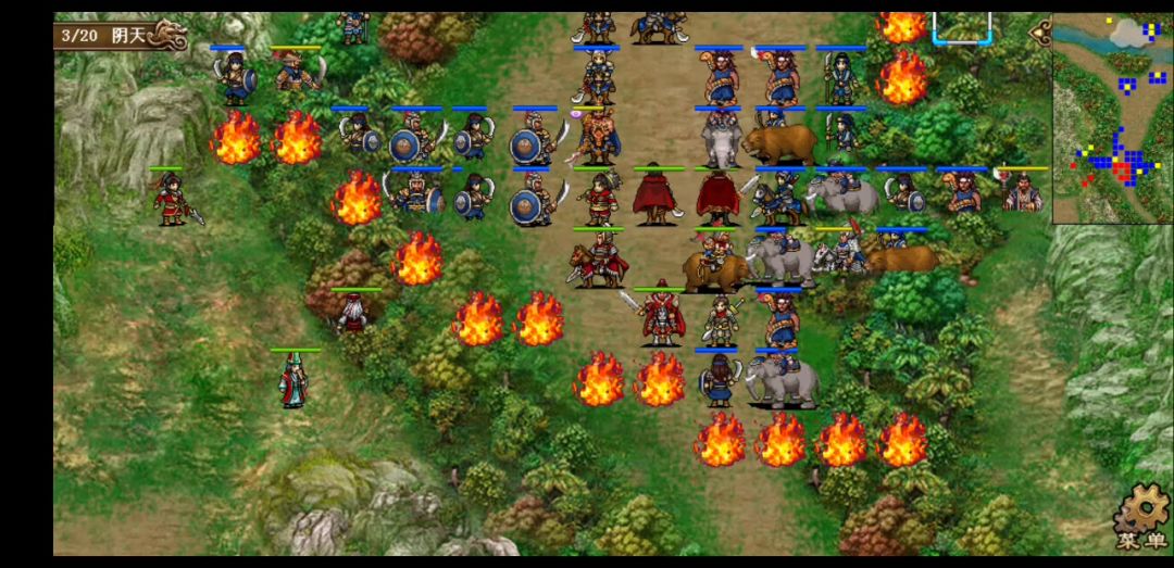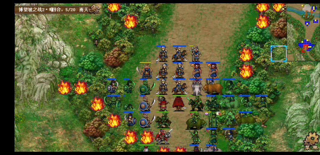 第一回合。前军全体向后退,大夏张合许褚曹操边输出边挡任左边敌军,曹洪咒骂廖化配合李典和后军张合一动强行,二动砍贼兵,然后参与右路卡位,乐进一动强行荀彧二动变雨天,荀攸回归荀彧放火龙。