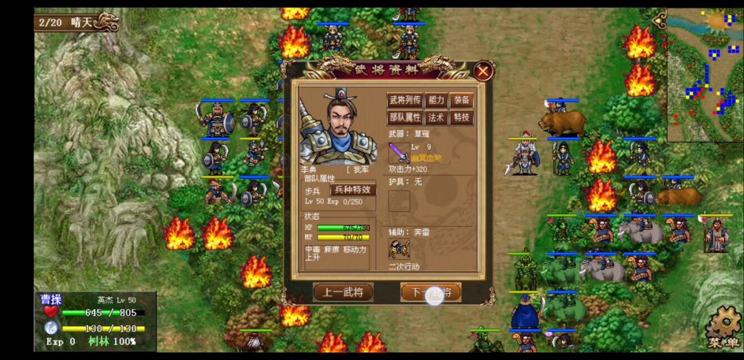 第二回合。李典曹洪大夏攻击廖化,张合一动致盲张飞让他下回合不能攻击,二动击杀廖化后补位,张任封咒简雍,其他人抱团成九宫格。乐进一动变雨天,二动定住刘封和周仓,由于没有复活这一回合是最危险。