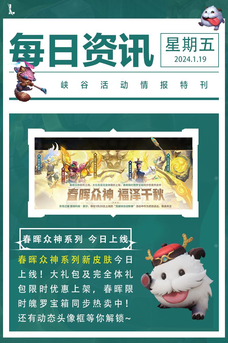 今日起,截止至2月7日23:59,春晖众神赐福大礼包限时上架,四款皮肤全部8折优惠,还有皮肤姿态、皮肤边框、头像框等道具也都享钜惠,总优惠价4720点券。