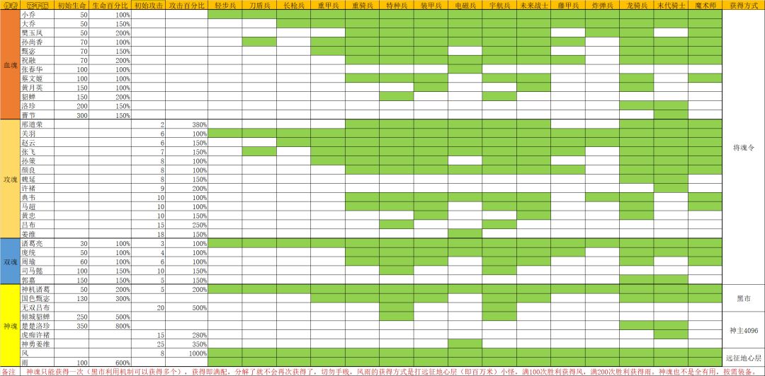 这个最初是想更新一下兵种的初始属性的,老表有几个都不对了,然后又加了将魂推荐和常规极限属性要求,算是个三合一表。