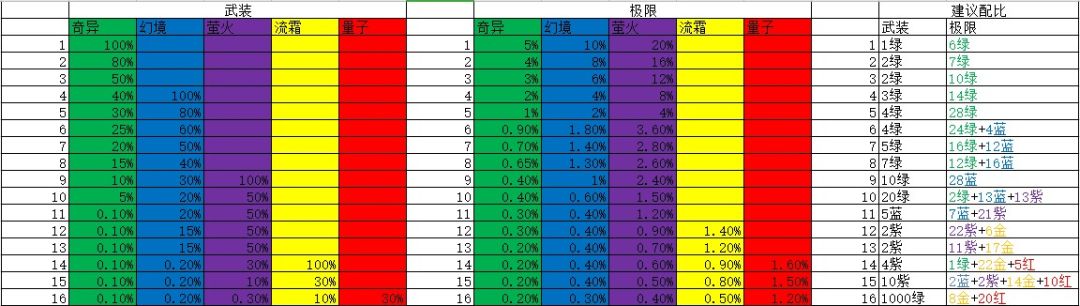 这个是量子武装的武装表和极限表,其他大佬已经有几个不同的版本了,不过有的也是老表,注意,这个推荐是按能低级果子就不高级果子的原则来的(15极限不是,15极限最低是20金8红),不想用推荐就自己算。