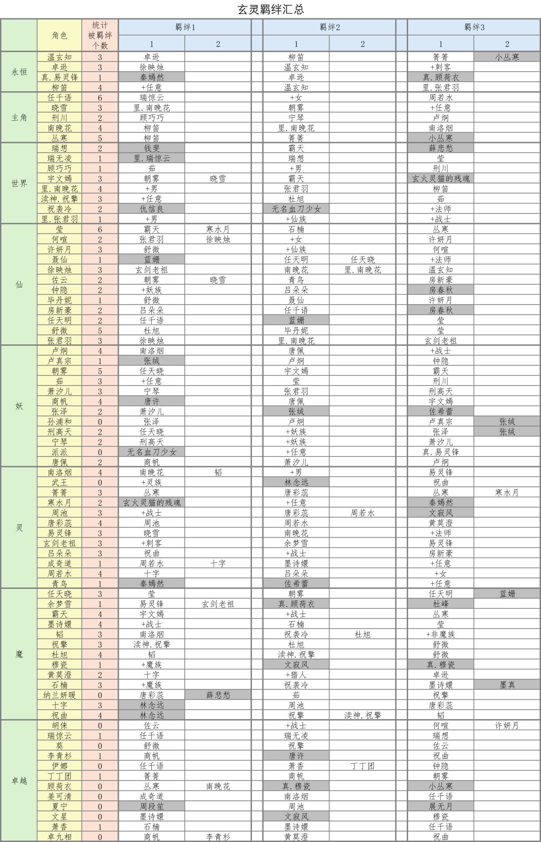 注:玄灵顺序参照游戏玄灵图鉴编排;灰色填充的玄灵为“稍后时日,羁绊之人自会到来”;带+号的,字面意思,可以去游戏玄灵那里筛选查找。