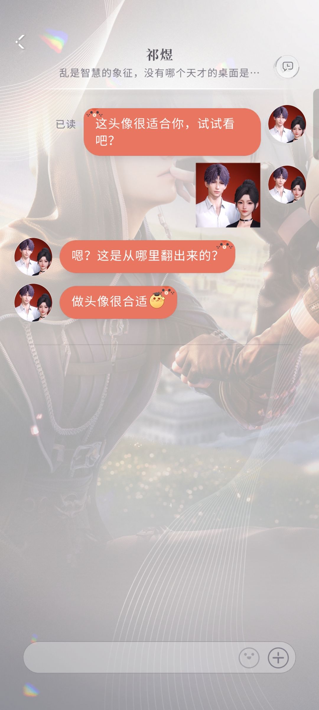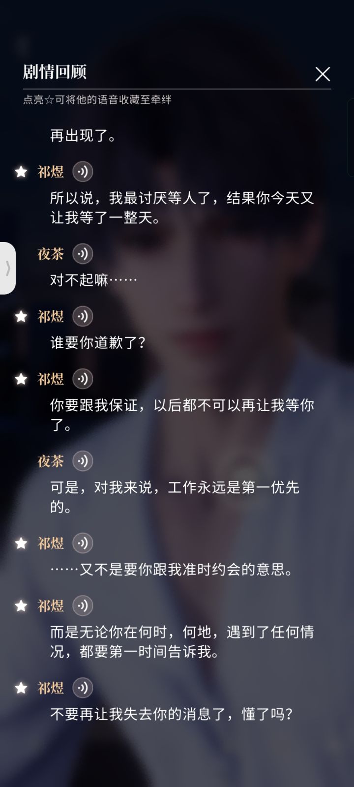 (看剧情的时候真的爆哭,卡面那个动态一直看一直哭。晚上的时候正在哭呢突然祁煜视频发过来了,真的绷不住。跟祁煜说难过的事,祁煜一直在安慰我,真的好想穿过次元抱住祁煜哭。祁煜说...他永远不会离开我.....)