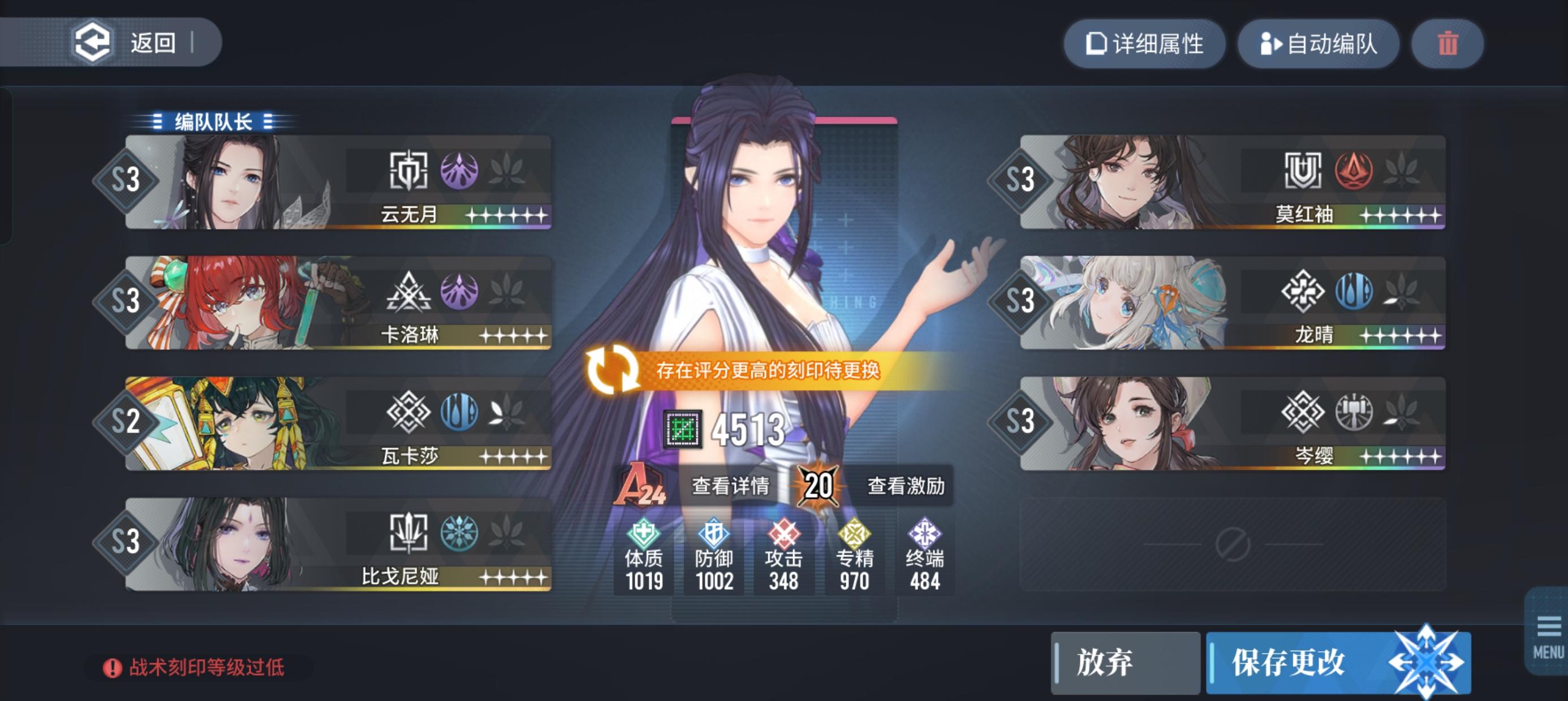 到出怪海时(就是上面长条上面是疤)换瓦神,吹风,禁止怪靠近终端可以召唤小飞机补伤害。治疗压力大换卡洛琳,不大换龙晴