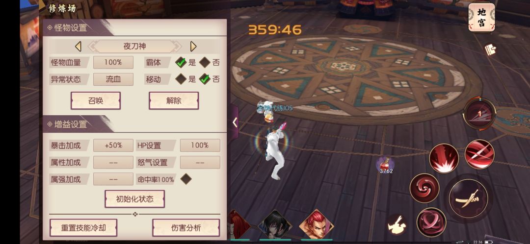 修炼场夜刀神,调出血常驻,调满暴击,不开怒,御守玄武减甲处于激活状态。
