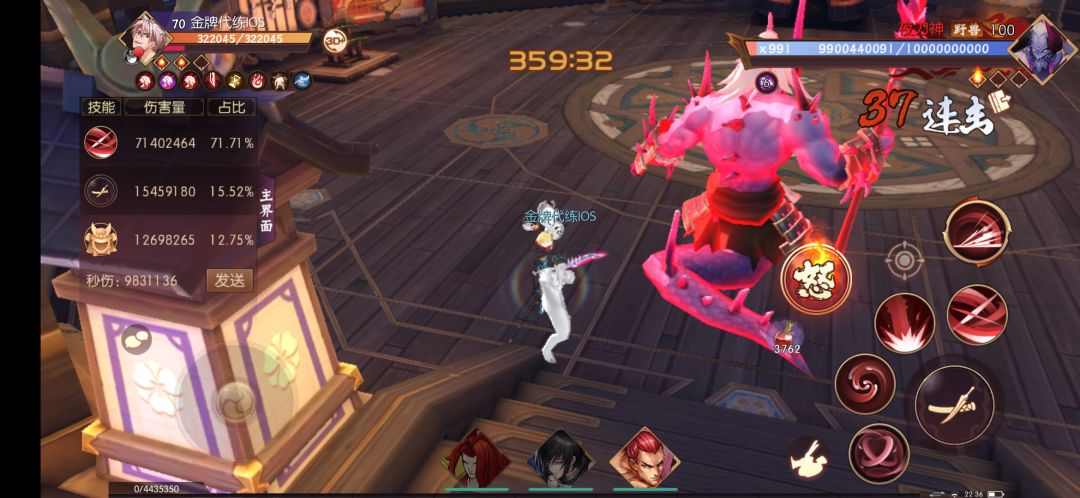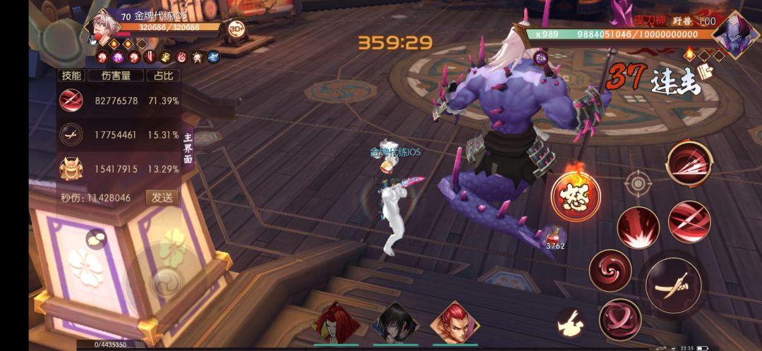 满爆,出血常驻先平a打出玄武御守的减甲,再扔一个技能,连击数37。